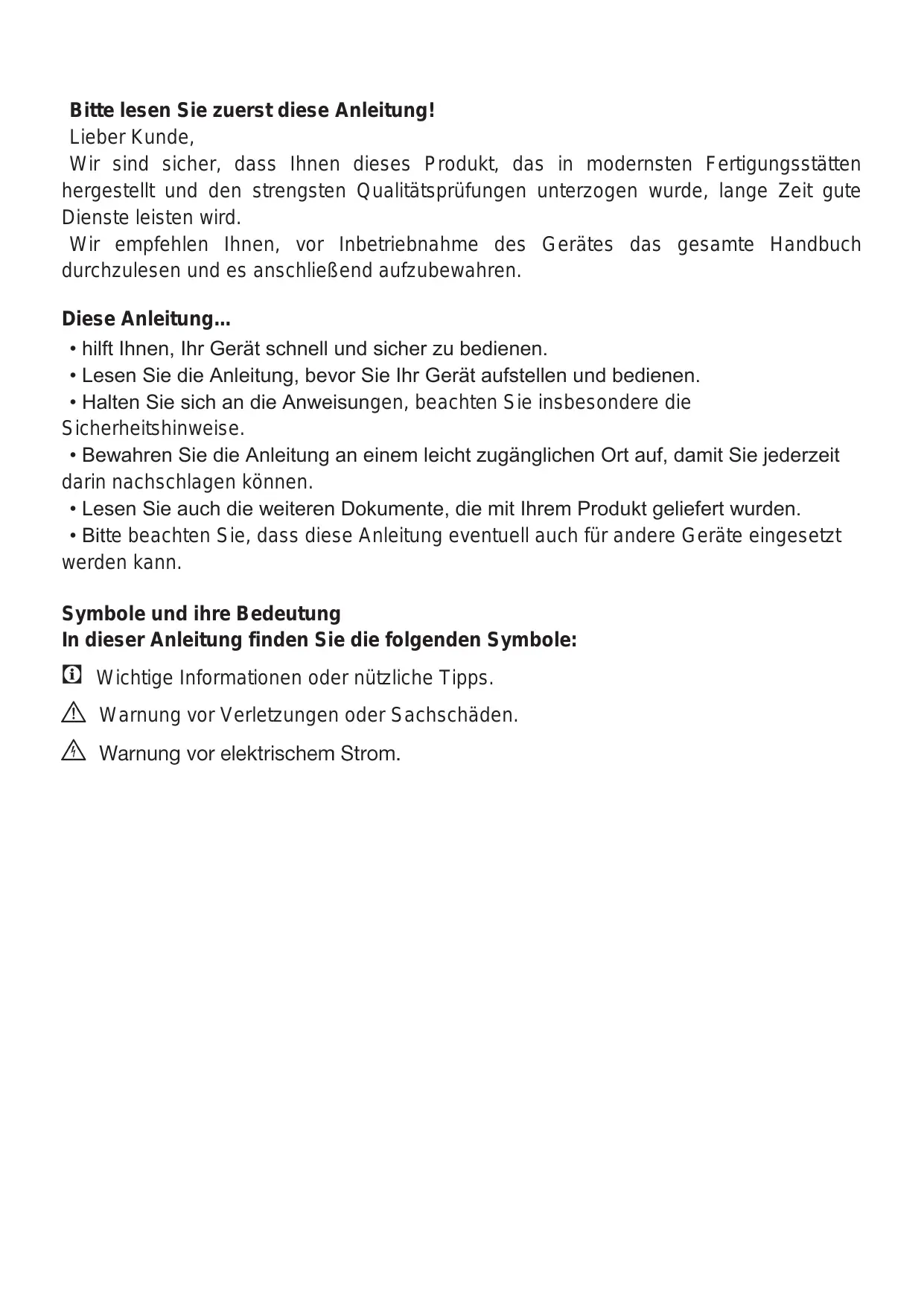 Bitte lesen Sie zuerst diese Anleitung! Lieber Kunde, Wir sind sicher, dass Ihnen dieses Produkt, das in modernsten Fertigungsstätten hergestellt und den strengsten Qualitätsprüfungen unterzogen wurde, lange Zeit gute Dienste leisten wird. Wir empfehlen Ihnen, vor Inbetriebnahme des Gerätes das gesamte Handbuch durchzulesen und es anschließend aufzubewahren. Diese Anleitung... • hilft Ihnen, Ihr Gerät schnell und sicher zu bedienen. • Lesen Sie die Anleitung, bevor Sie Ihr Gerät aufstellen und bedienen. • Halten Sie sich an die Anweisungen, beachten Sie insbesondere die Sicherheitshinweise. • Bewahren Sie die Anleitung an einem leicht zugänglichen Ort auf, damit Sie jederzeit darin nachschlagen können. • Lesen Sie auch die weiteren Dokumente, die mit Ihrem Produkt geliefert wurden. • Bitte beachten Sie, dass diese Anleitung eventuell auch für andere Geräte eingesetzt werden kann. Symbole und ihre Bedeutung In dieser Anleitung finden Sie die folgenden Symbole: Wichtige Informationen oder nützliche Tipps. Warnung vor Verletzungen oder Sachschäden.