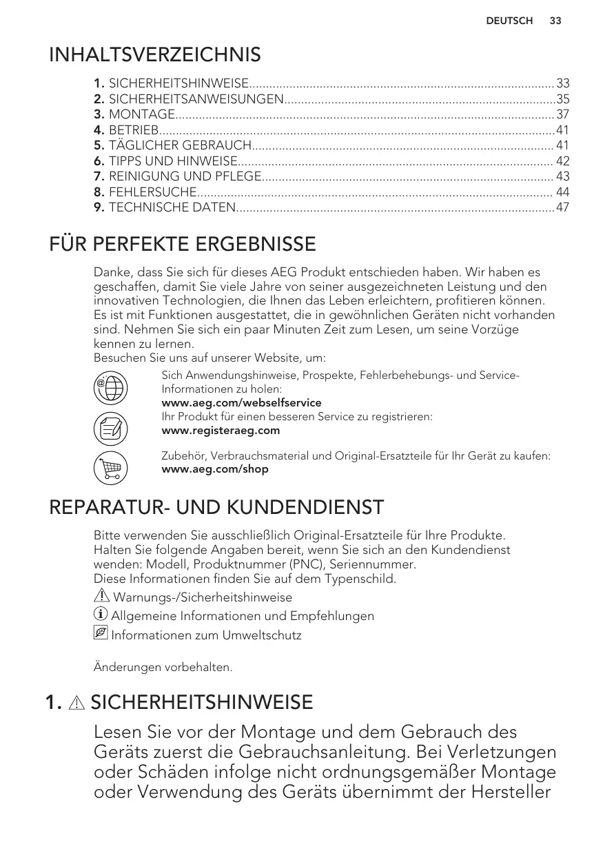 INHALTSVERZEICHNIS 1. SICHERHEITSHINWEISE 33 2. SICHERHEITSANWEISUNGEN35 3. MONTAGE 37 4. BETRIEB41 5. TÄGLICHER GEBRAUCH 41 6. TIPPS UND HINWEISE 42 7. REINIGUNG UND PFLEGE 43 8. FEHLERSUCHE 44 9. TECHNISCHE DATEN47