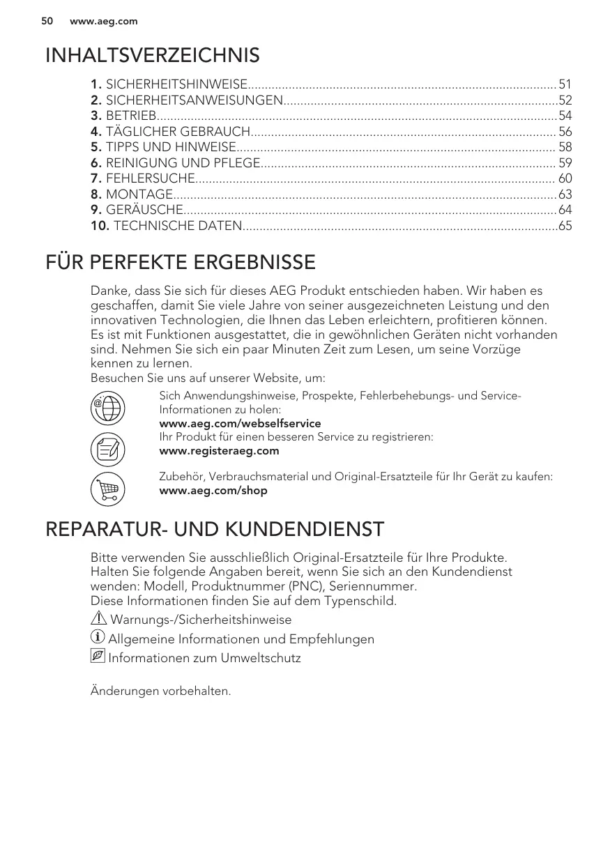 Danke, dass Sie sich für dieses AEG Produkt entschieden haben. Wir haben es geschaffen, damit Sie viele Jahre von seiner ausgezeichneten Leistung und den innovativen Technologien, die Ihnen das Leben erleichtern, profitieren können. Es ist mit Funktionen ausgestattet, die in gewöhnlichen Geräten nicht vorhanden sind. Nehmen Sie sich ein paar Minuten Zeit zum Lesen, um seine Vorzüge kennen zu lernen. Besuchen Sie uns auf unserer Website, um: Sich Anwendungshinweise, Prospekte, Fehlerbehebungs- und ServiceInformationen zu holen: www.aeg.com/webselfservice Ihr Produkt für einen besseren Service zu registrieren: www.registeraeg.com Zubehör, Verbrauchsmaterial und Original-Ersatzteile für Ihr Gerät zu kaufen: www.aeg.com/shop