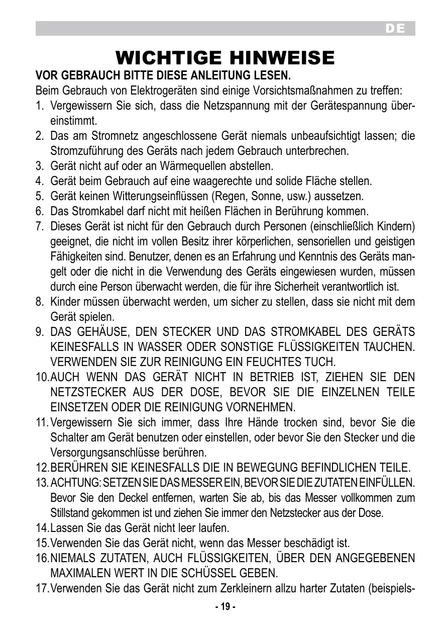 2. Ne laissez jamais l’appareil sans surveillance lorsqu’il est branché au réseau électrique; débranchez-le après chaque utilisation. 3. Ne placez pas l’appareil au dessus ou près de sources de chaleur. 4. Lors de son utilisation, placez l’appareil sur une surface horizontale et stable. 5. N’exposez jamais l’appareil aux agents atmosphériques externes (pluie, soleil, etc.). 6. Veillez à ce que le câble électrique n’entre jamais en contact avec des surfaces chaudes. 7. Cet appareil n’est pas indiqué pour l’utilisation de la part de personnes (y compris les enfants) ayant des capacités physiques, sensorielles ou mentales réduites. Les utilisateurs n’ayant pas l’expérience, une connaissance suffisante de l’appareil ou n’ayant pas reçu les instructions relatives à l’appareil, devront faire l’objet d’un contrôle de supervision de la part d’une personne responsable de leur sécurité. 8. Il est nécessaire de surveiller les enfants pour empêcher qu’ils ne jouent avec l’appareil. 9. NE PAS PLONGER LE CORPS DU PRODUIT, LA FICHE NI LE CABLE ELECTRIQUE DANS L’EAU OU AUTRES LIQUIDES, ET UTILISER TOUJOURS UN CHIFFON HUMIDE POUR LES NETTOYER. 10. MEME LORSQUE L’APPAREIL N’EST PAS EN MARCHE, DEBRANCHER LA FICHE DE LA PRISE DE COURANT ELECTRIQUE AVANT D’INSTALLER OU DE DEFAIRE LES SIMPLES PARTIES OU AVANT DE PROCEDER AU NETTOYAGE. 11. Vérifier d’avoir toujours les mains sèches avant d’utiliser ou de régler les interrupteurs placés sur l’appareil ou avant de manipuler la fiche et les connexions électriques. 12. NE TOUCHEZ JAMAIS LES PARTIES EN MOUVEMENT. 13. ATTENTION: INTRODUIRE LA LAME AVANT LES ALIMENTS. Avant de retirer le couvercle, attendre que la lame soit entièrement arrêtée et débrancher la fiche d’alimentation de la prise de courant. 14. Ne faites pas fonctionner l’appareil à vide. 15. N’utilisez pas l’appareil si la lame est endommagée. - 13 -