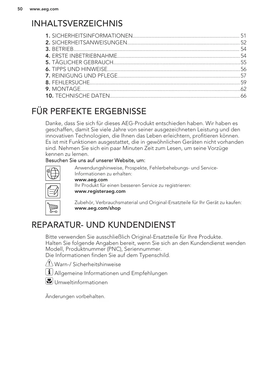 INHALTSVERZEICHNIS 1. SICHERHEITSINFORMATIONEN 51 2. SICHERHEITSANWEISUNGEN 52 3. BETRIEB 54 4. ERSTE INBETRIEBNAHME 54 5. TÄGLICHER GEBRAUCH55 6. TIPPS UND HINWEISE 56 7. REINIGUNG UND PFLEGE57 8. FEHLERSUCHE 59 9. MONTAGE62 10. TECHNISCHE DATEN 66