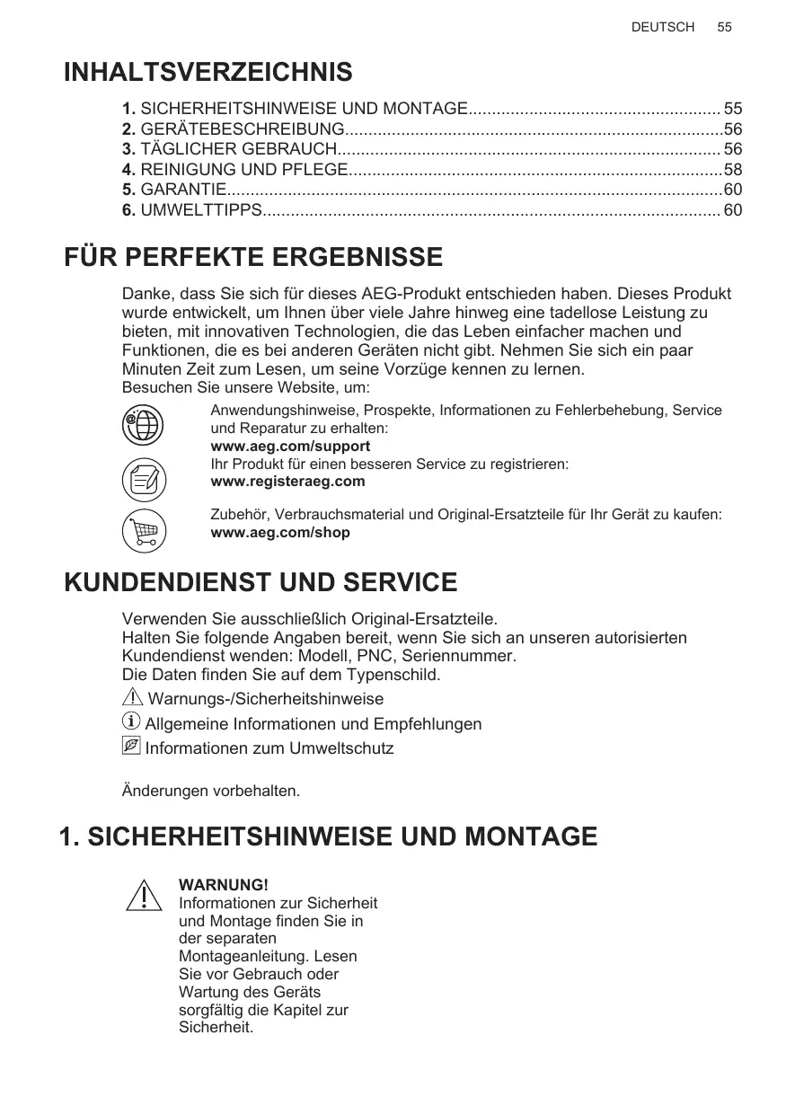 INHALTSVERZEICHNIS 1. SICHERHEITSHINWEISE UND MONTAGE 55 2. GERÄTEBESCHREIBUNG56 3. TÄGLICHER GEBRAUCH 56 4. REINIGUNG UND PFLEGE58 5. GARANTIE60 6. UMWELTTIPPS 60