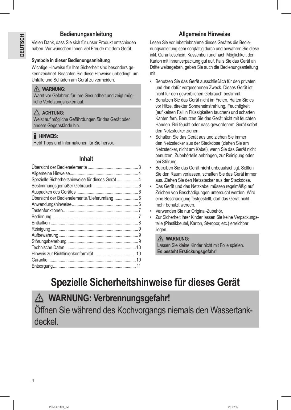BEDIENUNGSANLEITUNG PC-KA1191 PROFICOOK