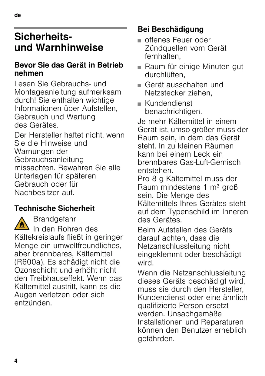 deInhaltsverzeichnisdeGebrauchsanleitungKühl- und Gefrierkombination Sicherheitsund Warnhinweise Bevor Sie das Gerät in Betrieb nehmen Lesen Sie Gebrauchs- und Montageanleitung aufmerksam durch! Sie enthalten wichtige Informationen über Aufstellen, Gebrauch und Wartung des Gerätes. Der Hersteller haftet nicht, wenn Sie die Hinweise und Warnungen der Gebrauchsanleitung missachten. Bewahren Sie alle Unterlagen für späteren Gebrauch oder für Nachbesitzer auf. Technische Sicherheit Brandgefahr In den Rohren des Kältekreislaufs fließt in geringer Menge ein umweltfreundliches, aber brennbares, Kältemittel (R600a). Es schädigt nicht die Ozonschicht und erhöht nicht den Treibhauseffekt. Wenn das Kältemittel austritt, kann es die Augen verletzen oder sich entzünden.