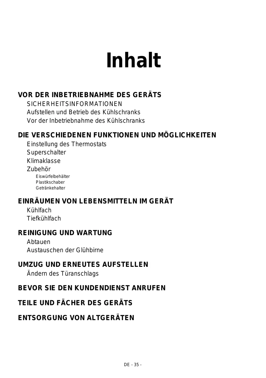 LES DIFFERENTES FONCTIONS ET POSSIBILITES Réglage du thermostat Super commutateur DISPOSITION DES ALIMENTS DANS L’APPAREIL Compartiment du réfrigérateur Compartiment congélateur TRANSPORT ET REPOSITIONNEMENT Remise en place de la porte