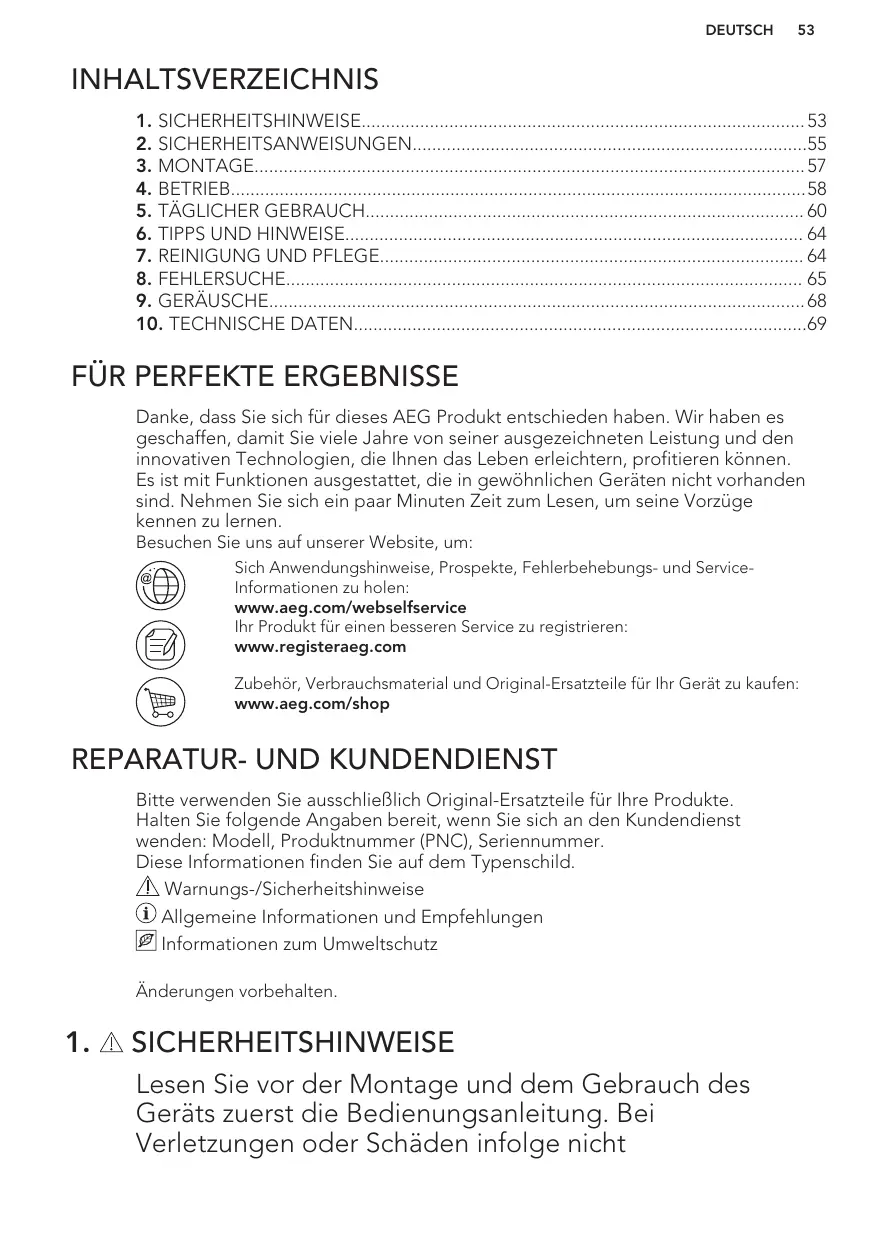 INHALTSVERZEICHNIS 1. SICHERHEITSHINWEISE 53 2. SICHERHEITSANWEISUNGEN55 3. MONTAGE 57 4. BETRIEB58 5. TÄGLICHER GEBRAUCH 60 6. TIPPS UND HINWEISE 64 7. REINIGUNG UND PFLEGE 64 8. FEHLERSUCHE 65 9. GERÄUSCHE 68 10. TECHNISCHE DATEN69