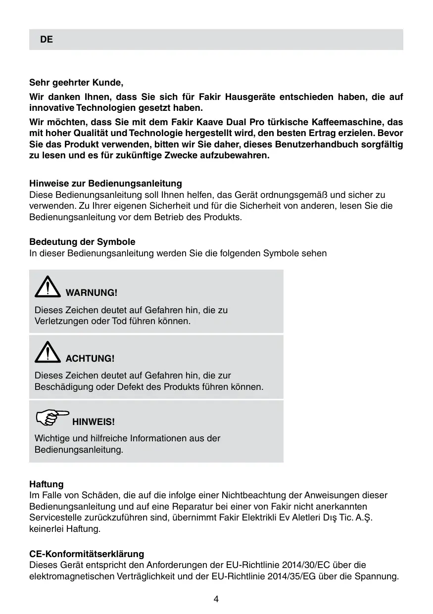 DE Sehr geehrter Kunde, Wir danken Ihnen, dass Sie sich für Fakir Hausgeräte entschieden haben, die auf innovative Technologien gesetzt haben. Wir möchten, dass Sie mit dem Fakir Kaave Dual Pro türkische Kaffeemaschine, das mit hoher Qualität und Technologie hergestellt wird, den besten Ertrag erzielen. Bevor Sie das Produkt verwenden, bitten wir Sie daher, dieses Benutzerhandbuch sorgfältig zu lesen und es für zukünftige Zwecke aufzubewahren. Hinweise zur Bedienungsanleitung Diese Bedienungsanleitung soll Ihnen helfen, das Gerät ordnungsgemäß und sicher zu verwenden. Zu Ihrer eigenen Sicherheit und für die Sicherheit von anderen, lesen Sie die Bedienungsanleitung vor dem Betrieb des Produkts. Bedeutung der Symbole In dieser Bedienungsanleitung werden Sie die folgenden Symbole sehen