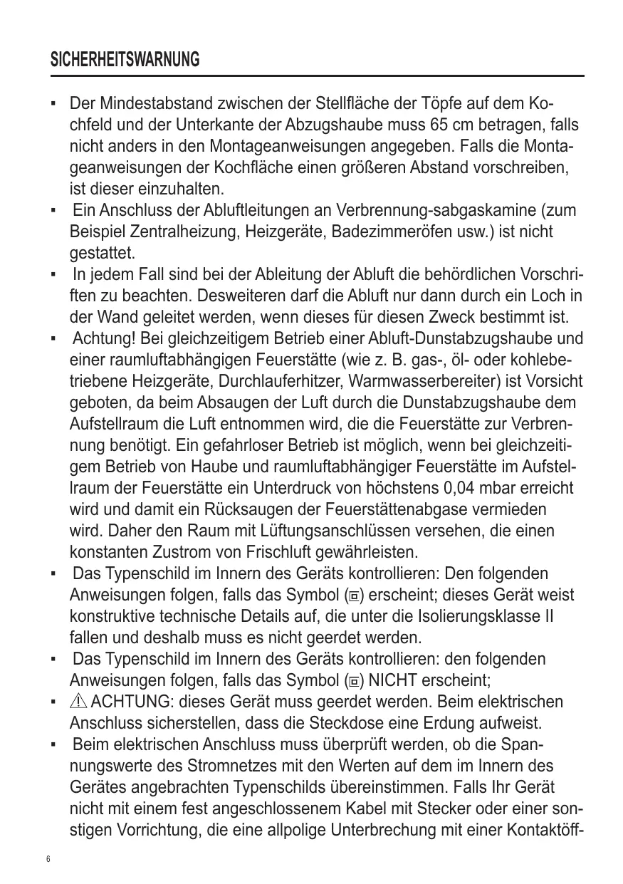 ▪ L’air aspiré ne doit pas être canalisé dans un conduit qui est utilisé pour évacuer les fumées produites par des appareils alimentés par des sources d’énergies autres que l’énergie électrique (installations de chauffage central, radiateurs, chauffe-eau, etc.). ▪ Pour évacuer l’air qui doit être éliminé respectez les prescriptions des autorités compétentes. De plus l’air qui doit être évacué ne doit pas être déchargé dans une cavité du mur, à moins que cette cavité soit prévue pour ce but. ▪ Prévoyez une aération de la pièce adéquate quand une hotte et des appareils alimentés par une énergie autre que l’énergie électrique (poêle à gaz, à huile, à charbon etc.) sont utilisés en même temps. En effet, en évacuant l’air, la hotte pourrait créer une dépression dans la pièce. La pression négative de la pièce ne doit pas dépasser 0,04mbar, évitant ainsi que la source de chaleur provoque un appel des gaz qui doivent être évacués. Il est donc nécessaire d’équiper la pièce de prises d’air alimentant un flux d’air frais constant. ▪ Contrôler la plaque des caractéristiques techniques se trouvant à l’intérieur de l’appareil; si le symbole ( ) figure sur la plaque suivre les instructions suivantes: cet appareil est construit pour appartenir à la classe d’isolation II ; il ne doit donc pas être relié à la terre. ▪ Contrôler la plaque des caractéristiques techniques se trouvant à l’intérieur de l’appareil; si le symbole ( ) NE figure pas sur la plaque suivre les instructions suivantes: ATTENTION: cet appareil doit être relié à la terre. Lors du raccordement électrique s’assurer que la prise de courant est équipée d’une connexion de mise à la terre. ▪ Lors du raccordement électrique assurez-vous que les valeurs de tension correspondent à celles qui sont indiquées sur la plaque des caractéristiques de l’appareil, qui se trouve à l’intérieur de celui-ci. Si votre appareil, n’a pas de câble flexible qui ne peut pas être séparé ni de prise, ou bien d’autre dispositif qui garantisse le débranchement de tous les 10