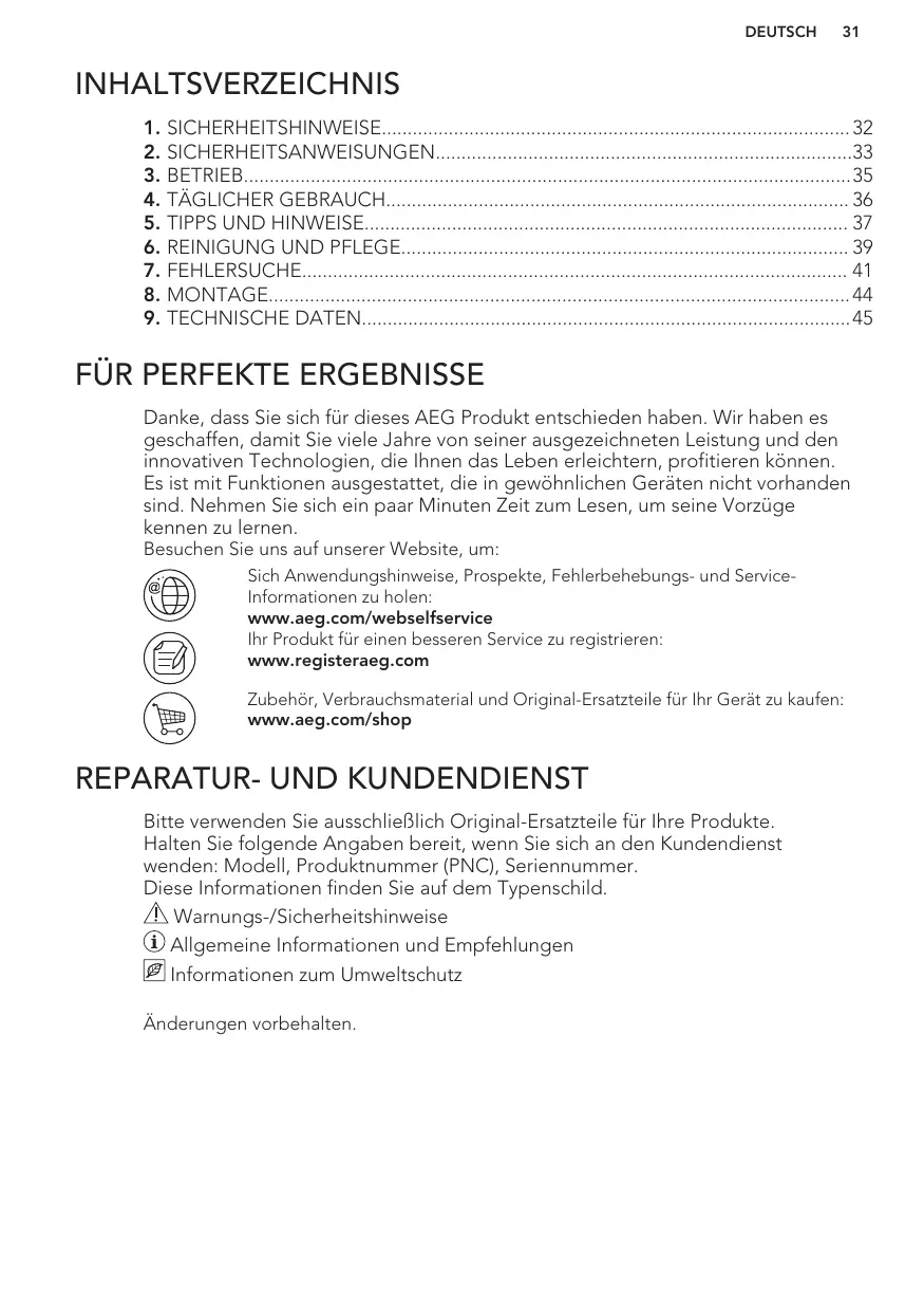 INHALTSVERZEICHNIS 1. SICHERHEITSHINWEISE 32 2. SICHERHEITSANWEISUNGEN33 3. BETRIEB35 4. TÄGLICHER GEBRAUCH 36 5. TIPPS UND HINWEISE 37 6. REINIGUNG UND PFLEGE 39 7. FEHLERSUCHE 41 8. MONTAGE 44 9. TECHNISCHE DATEN45