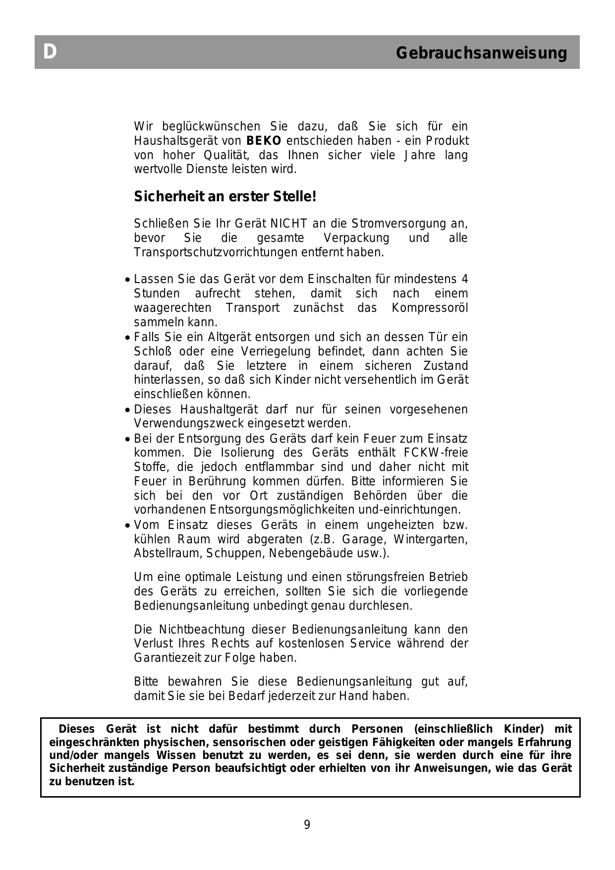 électrique avant d’avoir enlevé tous les emballages et protections de transport. • Attendez au moins 4 heures avant de le brancher pour permettre à l’huile du compresseur de se stabiliser si l’appareil a été transporté couché. • Si vous vous débarrassez d'un vieil appareil à ressort ou loquet intégré à la porte, prenez soin de le rendre hors de danger pour éviter que les enfants ne s'enferment à l’intérieur. • L’utilisation de cet appareil s’applique uniquement à l’usage prévu. • Ne vous débarrassez pas de l’appareil dans un feu. L’isolation de votre appareil contient des substances non CFC qui sont inflammables. Veuillez contacter les autorités locales pour obtenir des renseignements concernant la mise au rebut et les endroits existants. • L’utilisation de cet appareil dans une pièce froide, non chauffée n’est pas recommandée (garage, jardin d'hiver, annexe, abri, remise, etc.). Afin d’obtenir les meilleurs résultats possibles et un fonctionnement sans encombres de votre appareil, veuillez lire ces instructions attentivement. Le nonrespect de ces instructions pourrait annuler votre droit à l'assistance sans frais pendant la période de garantie. Veuillez conserver ces instructions soigneusement à titre de référence pratique. • Les pièces détachées d’origine sont disponibles pendant 10 ans, à compter de la date d’achat du produit. Cet appareil ne sera pas utilisé par des personnes ayant capacites physiques, sensorielles ou mentales réduites, ou sans experience concernant l'utilisation de l'appareil, si une personne responsable de leur sécurité ne les a pas instruites pour ce but. Les enfants doivent être surveillés pour avoir la certitude qu'ils ne jouent pas avec l'appareil.