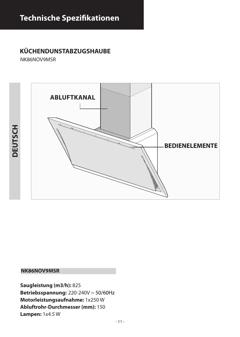 KÜCHENDUNSTABZUGSHAUBE NK86NOV9MSR DEUTSCH ABLUFTKANAL BEDIENELEMENTE NK86NOV9MSR Saugleistung (m3/h): 825 Betriebsspannung: 220-240V ~ 50/60Hz Motorleistungsaufnahme: 1x250 W Abluftrohr-Durchmesser (mm): 150 Lampen: 1x4.5 W - 11 -