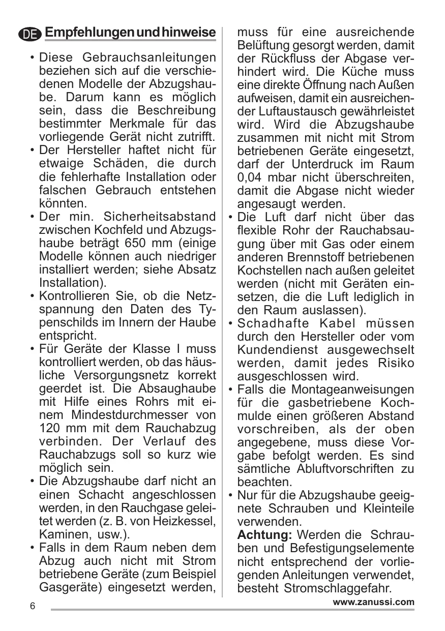Attention : toute installation des vis et des dispositifs de fixation non conforme aux présentes instructions peut entraîner des risques de décharges électriques. • Brancher la hotte à l’alimentation de secteur avec un interrupteur bipolaire ayant une ouverture des contacts d’au moins 3 mm.