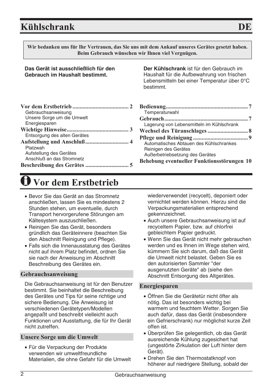 Vor dem Erstbetrieb 2 Gebrauchsanweisung Unsere Sorge um die Umwelt Energiesparen