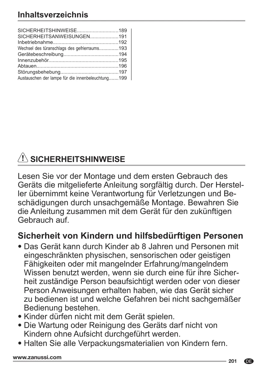 Finden Sie kostenlos die Bedienungsanleitung des Geräts ZRG10800WA ZANUSSI als PDF.