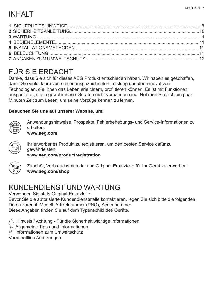 Lorsque vous contactez le Service Après-Vente agréé, munissez-vous des données suivantes : Modèle, Code produit (PNC), Numéro de série. Les informations se trouvent sur la plaque des données. Avertissement / Attention – Informations importantes pour la sécurité Conseils et suggestions Informations sur l’environnement Sous réserve de modifications.