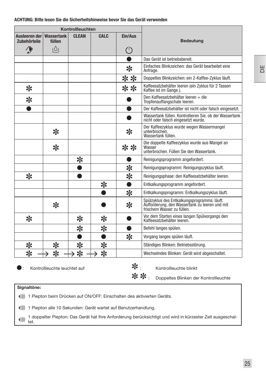 Vider le collecteur de marc (un cycle de 2 cafés est en cours). Vider le collecteur de marc + vider le bac récoltegouttes. Le collecteur de marc est absent ou mal positionné. Remplir le réservoir d'eau. Le réservoir d'eau est absent ou mal positionné. Le cycle café a été interrompu par manque d'eau. Remplir le réservoir d'eau. Le cycle double café a été interrompu par manque d'eau. Remplir le réservoir. Programme de nettoyage demandé. Programme de nettoyage : cycle de nettoyage en cours. Phase de nettoyage : vider le bac à marc. Programme de détartrage demandé. Programme de détartrage : cycle de détartrage en cours. Cycles de rinçage du programme de détartrage : en cours. Demande de vider et de remplir le réservoir d'eau. Vider le bac à cake avant le lancement d'un rinçage long. Demande rinçage long. Rinçage long en cours. Clignotement Simultané : anomalie de fonctionnement. Clignotement voyant après voyant : mise en hors tension de l'appareil en cours. :