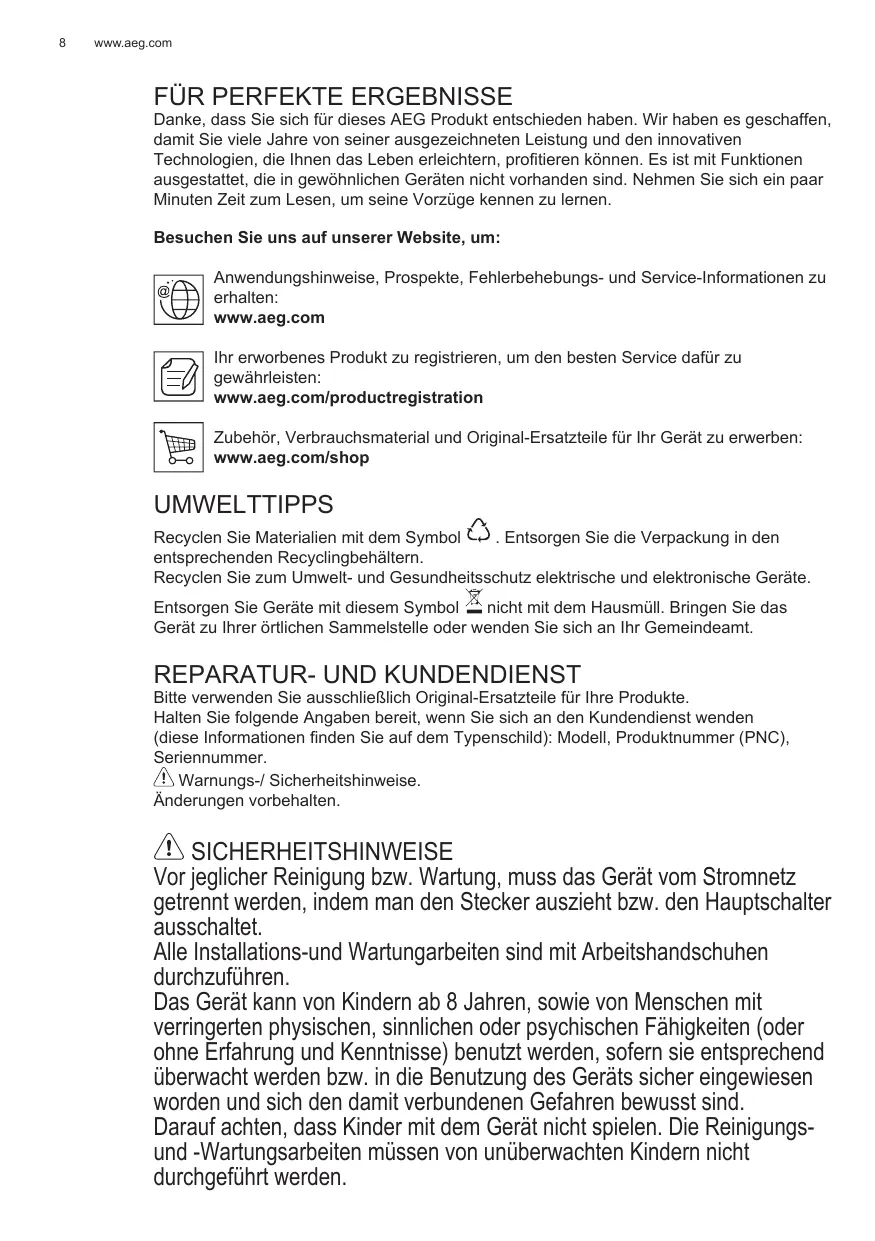 Enregistrer votre produit pour obtenir un meilleur service : www.aeg.com/productregistration Acheter des accessoires, consommables et pièces de rechange d’origine pour votre appareil : www.aeg.com/shop