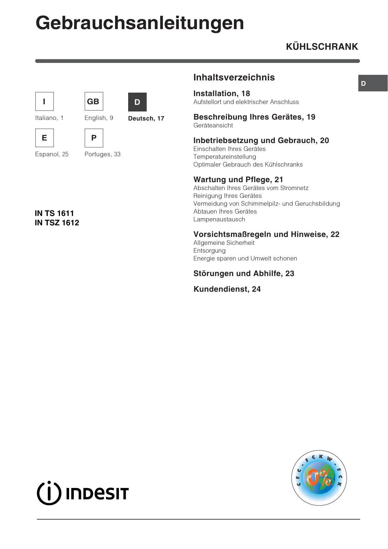 Laden Sie die Anleitung für Ihr Kühlschrank kostenlos im PDF-Format! Finden Sie Ihr Handbuch INTS1612 - INDESIT und nehmen Sie Ihr elektronisches Gerät wieder in die Hand. Auf dieser Seite sind alle Dokumente veröffentlicht, die für die Verwendung Ihres Geräts notwendig sind. INTS1612 von der Marke INDESIT.