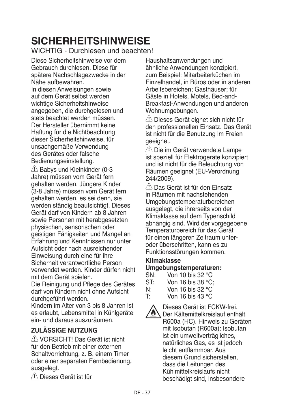 Cet appareil n’est pas conçu pour une utilisation professionnelle. N’utilisez pas l’appareil en extérieur. L’ampoule utilisée dans l’appareil est spécialement conçue pour des appareils ménagers et ne convient pas à l’éclairage général d’une pièce au domicile (Règlement CE 244/2009). L’appareil est conçu pour fonctionner dans des endroits où la température ambiante se trouve dans les plages suivantes, en fonction de la classe climatique indiquée sur la plaque signalétique. L’appareil peut ne pas fonctionner correctement s’il est exposé pendant une période prolongée à des températures non comprises dans la plage spécifiée. Températures ambiantes classe climatique : SN: De 10 à 32 °C ST: De 16 à 38 °C; N: De 16 à 32 °C T: