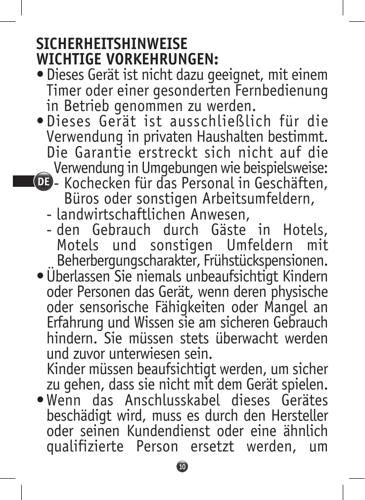 - por los clientes de hoteles, moteles y demás entornos de tipo residencial, - en entornos de tipo casas de turismo rural. • Este aparato no está previsto para ser utilizado por personas (incluso niños) cuyas capacidades físicas, sensoriales o mentales estén reducidas, o personas provistas de experiencia o de conocimiento, excepto sin han podido beneficiarse a través de una persona responsable de su seguridad, de una vigilancia o instrucciones previas referentes al uso del aparato. Hay que vigilar a los niños para asegurarse de que no juegan con el aparato. • Si el cable de alimentación está dañado, éste 18