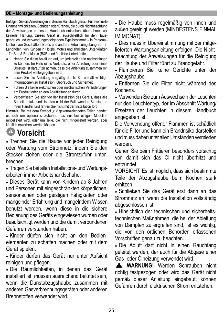 Befolgen Sie die Anweisungen in diesem Handbuch genau. Für eventuelle Unannehmlichkeiten, Schäden oder Brände, die durch Nichtbeachtung der Anweisungen in diesem Handbuch entstehen, übernehmen wir keinerlei Haftung. Dieses Gerät ist ausschließlich für den Hausgebrauch und Verwendungen folgenden Typs bestimmt: – in Personalküchen von Geschäften, Büros und anderen Arbeitsumgebungen; – in Landhöfen, von Kunden in Hotels, Motels und ähnlichen Unterkünften – für Bed & Breakfasts (B&B) und ähnliche Unterkünfte. • Heben Sie diese Anleitung auf, um jederzeit darin nachschlagen zu können. Im Falle eines Verkaufs, einer Abtretung oder eines Umzugs ist darauf zu achten, dass die Anleitung zusammen mit dem Produkt weitergegeben wird. • Lesen Sie die Anleitung sorgfältig durch: Sie enthält wichtige Informationen zu Installation, Gebrauch und Sicherheit. • Führen Sie keine elektrischen oder mechanischen Veränderungen am Produkt oder an den Abluftleitungen durch. • Vergewissern Sie sich vor der Installation des Geräts, dass alle Bauteile intakt sind. Ist dies nicht der Fall, wenden Sie sich an Ihren Händler und fahren Sie nicht mit der Installation fort. Hinweis: Bei mit dem Symbol „(*)“ gekennzeichneten Teilen handelt es sich um optionales Zubehör, das nur bei einigen Modellen mitgeliefert wird, oder um Teile, die nicht mitgeliefert werden, aber käuflich erworben werden können.