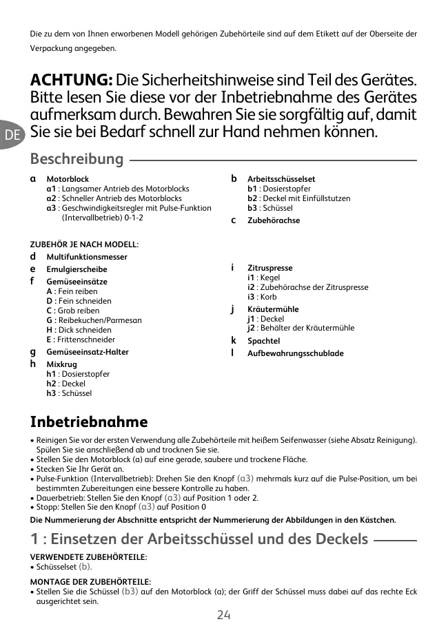 (selon modèle) • Placez l’ensemble sur le bloc moteur (a). MISE EN MARCHE ET CONSEILS : • Tournez le sélecteur de vitesse (a3) sur la position «2» pour la mise en marche, tout en maintenant le moulin fines-herbes sur le bloc moteur durant le fonctionnement. Vous pouvez utiliser la position «Pulse», pour un meilleur contrôle du mélange. • Avec le moulin fines-herbes (j) vous pouvez hacher en quelques secondes : - ail, persil, oignon, biscottes (pour chapelure), jambon… Quantité / Temps maximum : 50 g / 10 s - abricots secs, figues sèches, pruneaux dénoyautés Rincez le bol. • Ne mettez pas le bloc moteur (a) dans l’eau, ni sous l’eau courante. Essuyez-le avec une éponge humide. • Les lames des accessoires sont très affûtées. Manipulez-les avec précaution. Astuce : En cas de coloration de vos accessoires par des aliments (carottes, oranges...), frottez-les avec un chiffon imbibé d’huile alimentaire, puis procédez au nettoyage habituel.