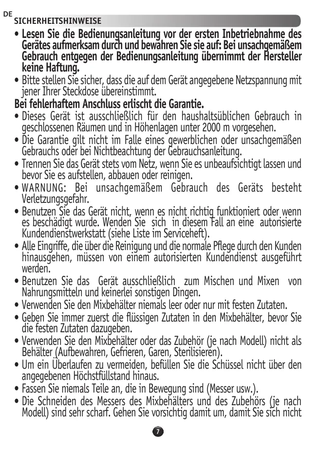 Toute erreur de branchement annule la garantie. • Votre appareil est destiné uniquement à un usage domestique à l’intérieur de la maison et à une altitude inférieure à 2000m. • La garantie ne s’appliquera pas en cas d’utilisation commerciale, inappropriée, ou non respect de la notice. • Toujours déconnecter l’appareil de l’alimentation si on le laisse sans surveillance et avant montage, démontage ou nettoyage. • Attention aux risques de blessure en cas de mauvaise utilisation de l’appareil. • N’utilisez pas votre appareil s’il ne fonctionne pas correctement ou s’il a été endommagé. Dans ce cas, adressez-vous à un centre service agréé (voir liste dans le livret service). • Toute intervention autre que le nettoyage et l’entretien usuel par le client doit être effectuée par un centre service agréé. • N’utilisez jamais cet appareil pour mélanger ou mixer d’autres éléments que des ingrédients alimentaires. • N’utilisez jamais le bol mixeur sans ingrédient ou avec des ingrédients solides uniquement. • Versez toujours les ingrédients liquides en premier dans le bol mixeur avant d’ajouter les ingrédients solides. • Ne pas utiliser le bol mixeur ou les accessoires (selon modèle) comme récipients (conservation, congélation, cuisson, stérilisation) • Afin d’éviter tout débordement, ne pas dépasser le niveau maximum du bol lorsque celui-ci est indiqué. • N e touchez jamais les pièces en mouvement (couteaux…). • Les lames du couteau du bol mixeur et des accessoires (selon modèle) sont très coupantes: manipulez-les avec précaution pour ne pas vous blesser lors du versage, du montage/démontage des 1