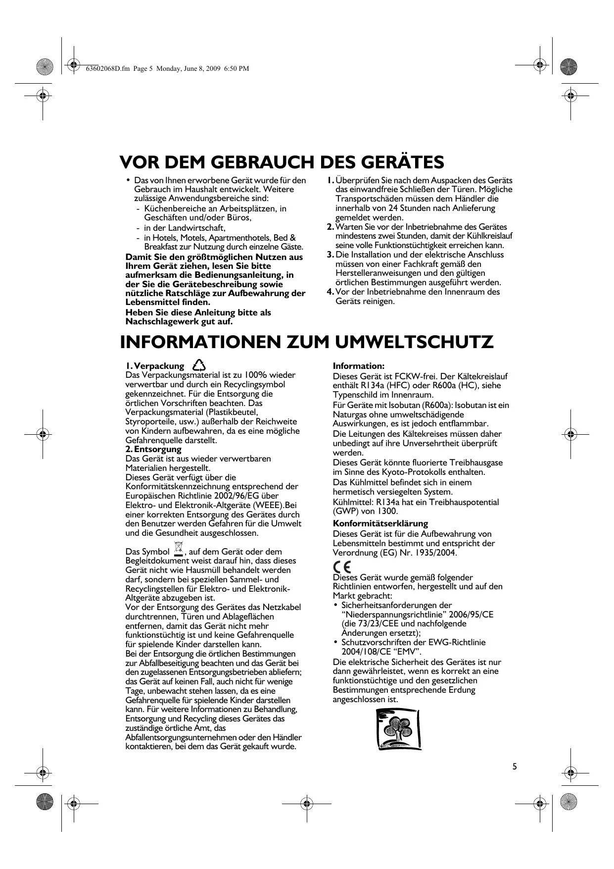 Cet appareil ne contient pas de CFC. Le circuit de refroidissement contient du R134a (HFC) ou R600a (HC), voir la plaquette signalétique à l’intérieur de l’appareil. Pour les appareils avec Isobutane (R600a) : l’isobutane est un gaz naturel qui est sans danger pour l’environnement, mais il est inflammable. Il est donc indispensable de s’assurer que les tuyaux du circuit de réfrigération sont en parfait état. Cet appareil pourrait contenir du gaz à effet de serre fluoré réglementé par le Protocole de Kyoto. Le gaz réfrigérant est hermétiquement scellé. Gaz réfrigérant: le R134 a une puissance de refroidissement (GWP) de 1300. Déclaration de conformité Cet appareil est destiné à la conservation de denrées alimentaires et est fabriqué conformément au règlement (CE) N° 1935/2004. Cet appareil a été conçu, construit et commercialisé conformément aux : • objectifs sécurité de la directive “Basse Tension” 2006/95/CE (qui remplace la 73/23/CEE et modifications); • conditions requises en matière de protection de la Directive “EMC” 2004/108/CE. La sécurité électrique de l’appareil est garantie uniquement lorsqu’il est correctement branché à une installation de mise à la terre efficace et conforme à la loi.