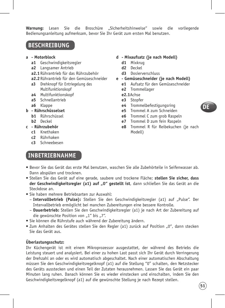 (a1) soit bien en position « 0 » puis branchez votre appareil. • Pour mettre en marche, vous avez plusieurs possibilités : ––Marche intermittente (pulse) : Tournez le bouton variateur (a1) sur la position « pulse » par impulsions successives pour un meilleur contrôle des préparations. ––Marche continue : Tournez le bouton variateur (a1) sur la position désirée de « 1 » à « 7 » selon les préparations effectuées. • Vous pouvez la modifier en cours de préparation. • Pour arrêter l’appareil, ramenez le bouton (a1) sur le « 0 », puis débranchez votre appareil. Protection surcharge : Votre appareil de cuisine est équipé d’un micro processeur qui contrôle et analyse la puissance en fonctionnement. En cas de charge trop importante, votre appareil s’adaptera en réduisant sa vitesse ou s’arrêtera tout seul. En cas d’arrêt, ramenez votre bouton variateur de vitesse (a1) sur la position «0», débranchez votre appareil et retirez une partie de vos ingrédients. Laissez votre appareil reposer quelques minutes. Vous pouvez alors le rebrancher et démarrer en tournant le bouton variateur (a1) sur la vitesse désirée selon la recette.