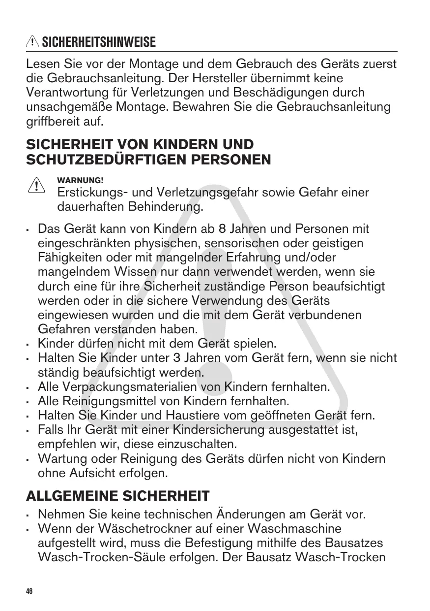 Les enfants de moins de 3 ans, sans surveillance, doivent être tenus à l'écart de l'appareil. Ne laissez pas les emballages à la portée des enfants. Ne laissez pas les détergents à la portée des enfants. Tenez les enfants et les animaux éloignés de la porte de l'appareil lorsque celle-ci est ouverte. Si l'appareil est équipé d'un dispositif de sécurité enfants, nous vous recommandons de l'activer. Le nettoyage et l’entretien par l'usager ne doivent pas être effectués par des enfants sans surveillance.
