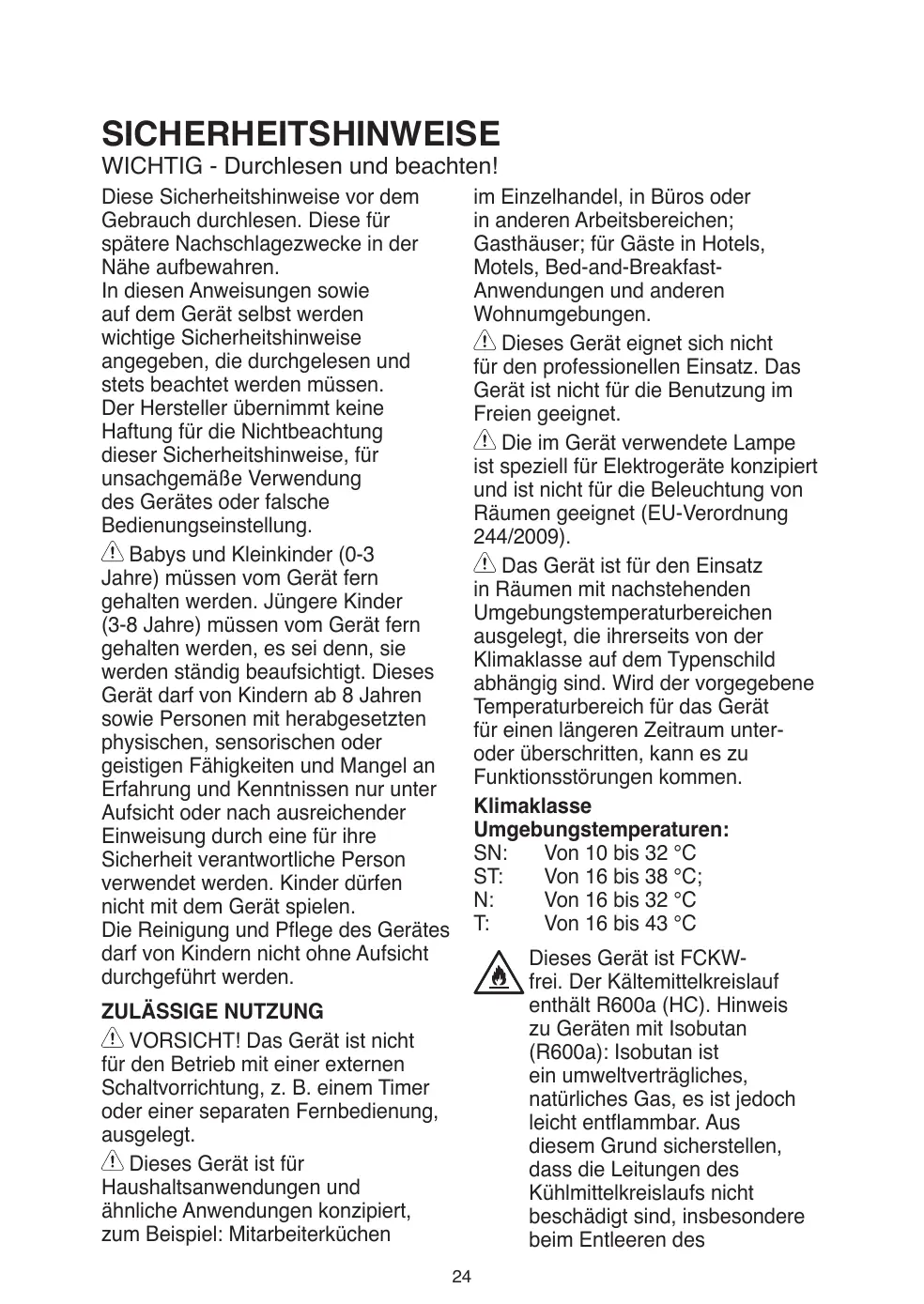 Cet appareil n’est pas conçu pour une utilisation professionnelle. N’utilisez pas l’appareil en extérieur. L’ampoule utilisée dans l’appareil est spécialement conçue pour des appareils ménagers et ne convient pas à l’éclairage général d’une pièce au domicile (Règlement CE 244/2009). L’appareil est conçu pour fonctionner dans des endroits où la température ambiante se trouve dans les plages suivantes, en fonction de la classe climatique indiquée sur la plaque signalétique. L’appareil peut ne pas fonctionner correctement s’il est exposé pendant une période prolongée à des températures non comprises dans la plage spécifiée. Températures ambiantes classe climatique : SN: De 10 à 32 °C ST: De 16 à 38 °C; N: De 16 à 32 °C T: De 16 à 43 °C Cet appareil ne contient pas de CFC. Le circuit de réfrigérant contient du R600a (HC). Appareils avec isobutane (R600a) : l’isobutane est un gaz naturel qui n’est pas nuisible à l’environnement, mais il est inflammable. Par conséquent, assurez-vous que les tuyaux du circuit réfrigérant ne sont pas endommagés, surtout lorsque vous videz le circuit réfrigérant.