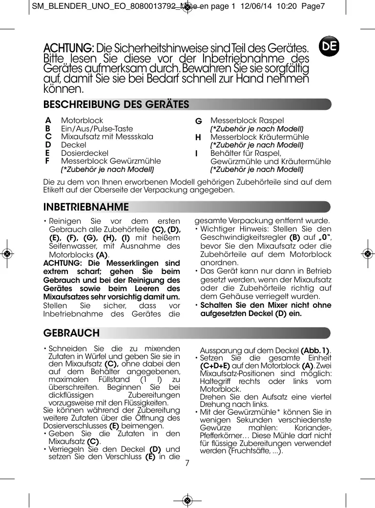 • Assurez-vous que tout emballage soit retiré avant le fonctionnement de l’appareil. • Remarque importante : Mettre le sélecteur de vitesse (B) sur «0» avant de placer le bol blender ou les accessoires sur le bloc moteur. • L’appareil démarre uniquement si le bol ou l’accessoire est bien positionné et verrouillé sur son corps. • Ne faites pas fonctionner le blender si le couvercle (D) n’est pas en place.