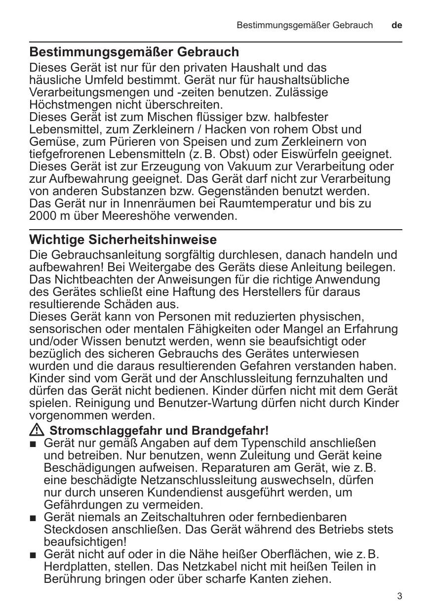 Dieses Gerät ist nur für den privaten Haushalt und das häusliche Umfeld bestimmt. Gerät nur für haushaltsübliche Verarbeitungsmengen und -zeiten benutzen. Zulässige Höchstmengen nicht überschreiten. Dieses Gerät ist zum Mischen flüssiger bzw. halbfester Lebensmittel, zum Zerkleinern / Hacken von rohem Obst und Gemüse, zum Pürieren von Speisen und zum Zerkleinern von tiefgefrorenen Lebensmitteln (z. B. Obst) oder Eiswürfeln geeignet. Dieses Gerät ist zur Erzeugung von Vakuum zur Verarbeitung oder zur Aufbewahrung geeignet. Das Gerät darf nicht zur Verarbeitung von anderen Substanzen bzw. Gegenständen benutzt werden. Das Gerät nur in Innenräumen bei Raumtemperatur und bis zu 2000 m über Meereshöhe verwenden.