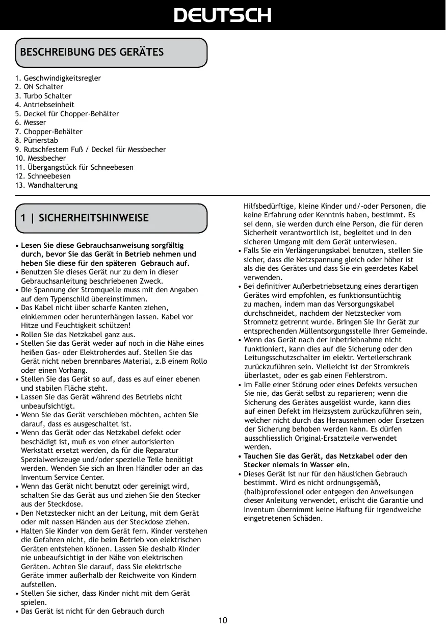 2 om de snelheid te 7 6 5 gebruiken die u bovenop de motor unit met de draaiknop 1 (regelbare snelheid) heeft ingesteld. Houdt tijdens het hakken de motor unit met een hand vast en met de andere hand de hakmolen. Let op: Schakel de hakmolen niet constant in, dit kan problemen aan de motor veroorzaken. Gebruik de hakmolen bij voorkeur 30 seconden per keer en laat de hakmolen daarna 2 minuten uit staan. • De deksel van de hakmolen mag onder de kraan afgespoeld worden. • Gebruik geen agressieve schoonmaakmiddelen. Deze kunnen het materiaal aantasten. • Dompel de motor unit nooit onder in water of andere vloeistoffen. • Deze accessoires mogen gereinigd worden in de vaatwasmachine: • Ne pas tirer sur le cordon électrique ni sur l’appareil lui-même pour retirer la fiche de la prise de courant murale. Ne jamais toucher l’appareil avec les mains mouillées ou humides. • Ne jamais laisser l’appareil à la portée des enfants. Les enfants ne sont pas conscients des dangers qui peuvent exister lors de l’utilisation d’appareils électriques. C’est pourquoi vous ne devez jamais laisser un enfant se servir de cet appareil sans surveillance. Veillez à ce que l’appareil soit toujours rangé de telle sorte que les enfants ne puissent pas y accéder. • L’appareil ne peut pas être utilisé par des infirmes ni par des enfants et/ou des personnes ne sachant pas s’en servir, sauf si ces personnes sont accompagnées ou aidées pour l’utilisation sans danger de l’appareil par une personne responsable de leur sécurité. • Vous ne pouvez utiliser une rallonge électrique que si le voltage et la puissance sont les mêmes (voir plaque technique) ou plus élevés que ceux du cordon livré avec l’appareil. Utilisez toujours une rallonge de cordon électrique de terre qui soit conforme aux normes de sécurité. • Si vous décidez de ne plus utiliser l’appareil en raison d’une panne ou d’une défectuosité, nous vous conseillons alors, une fois après avoir retiré la fiche de la prise de courant murale, de couper le cordon électrique. Emportez l’appareil au service correspondant de votre commune. • Si l’appareil, une fois mis en marche, ne fonctionne pas, il se peut alors que cela vienne du fusible ou du disjoncteur miniature dans la boîte de répartition électrique. Le groupe est peut-être trop chargé ou bien il y a eu du courant de fuite de terre. • En cas de perturbation ou de panne, n’essayez jamais de réparer vous-même l’appareil; si la sécurité de l’appareil a sauté, cela peut vouloir indiquer une défectuosité, et ceci ne peut pas se réparer en enlevant ou en remplaçant cette sécurité. Il est indispensable d’utiliser exclusivement des pièces détachées d’origine. • Ne plongez jamais l’appareil, le cordon électrique ou la fiche de l’appareil dans de l’eau ou dans tout autre liquide.