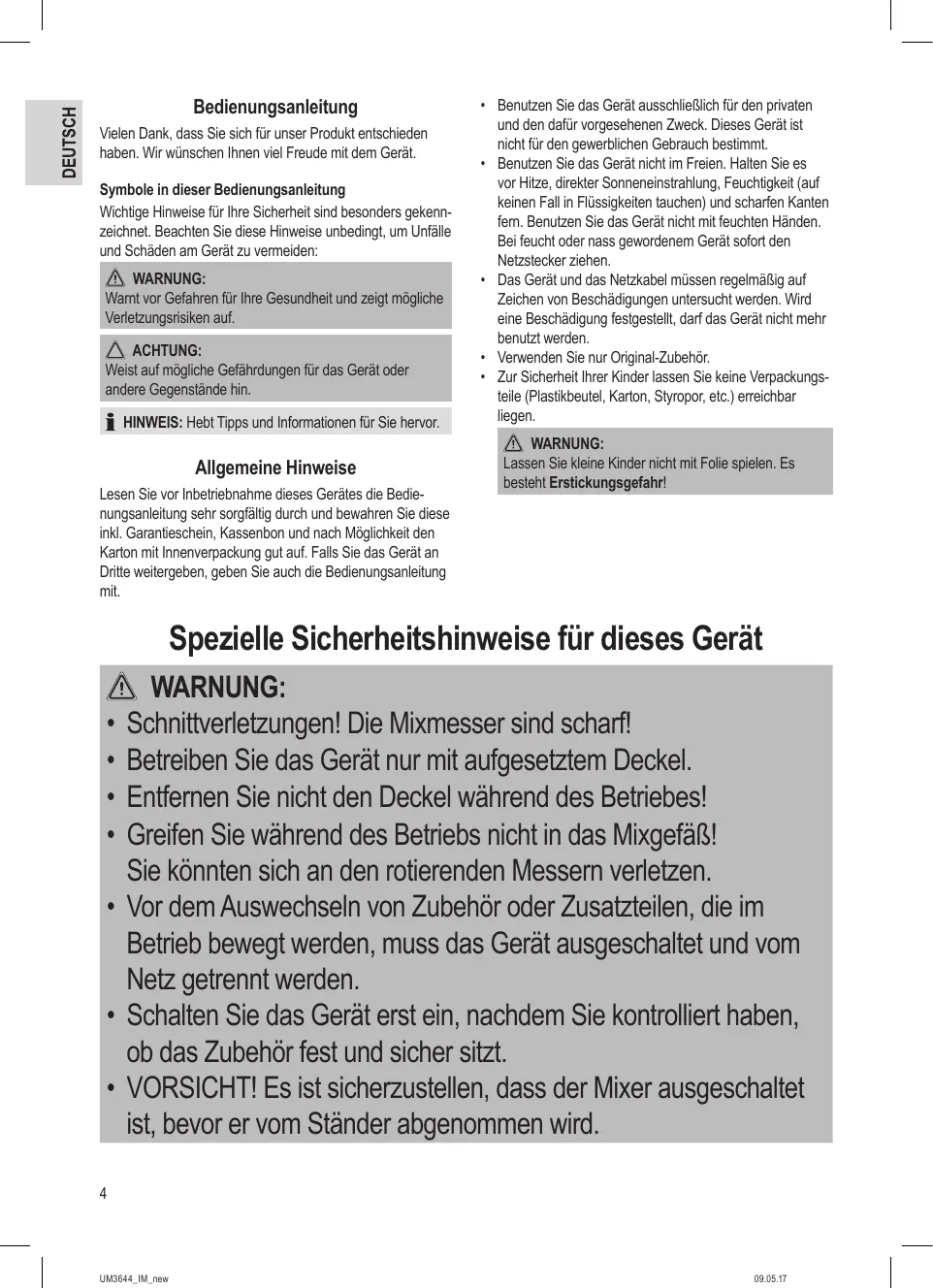 • • Ne retirez pas le couvercle pendant le fonctionnement ! Ne mettez pas les mains dans le mixeur en fonctionnement ! Vous pourriez être blessé par les lames rotatives. Avant de remplacer les accessoires ou d’ajouter des pièces en mouvement durant le fonctionnement, l’appareil doit être à l’arrêt et débranché de la prise électrique. Avant de remplacer les pièces accessoires, attendez que les lames se soient immobilisées. ATTENTION : N’oubliez pas d’éteindre le mixeur avant de le retirer du socle. 15