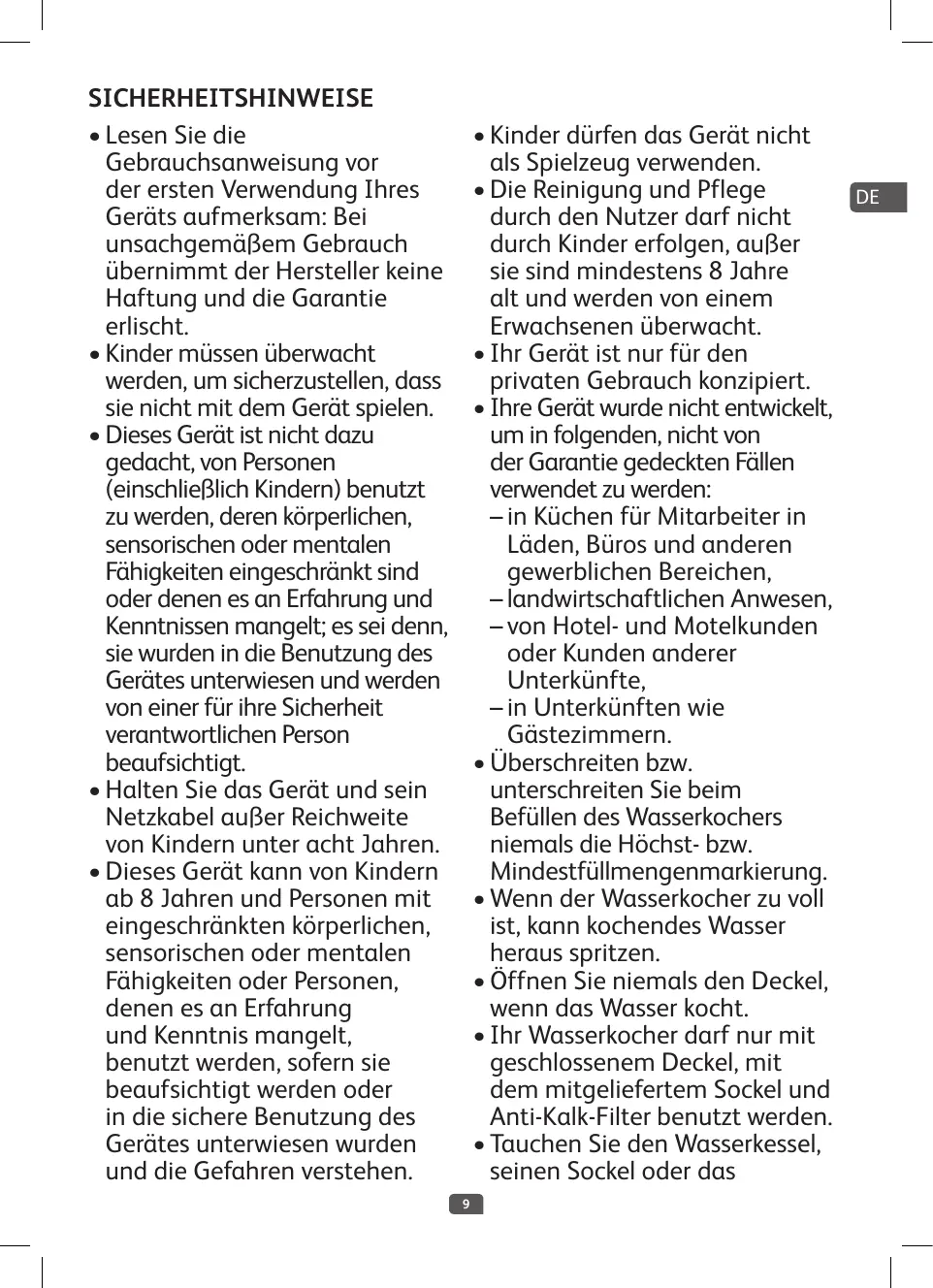 Laissez-la refroidir et nettoyez-la avec une éponge humide. • Ne plongez jamais la bouilloire, son socle, le fil ou la prise électrique dans l’eau : les connections électriques ou l’interrupteur ne doivent pas être en contact avec l’eau. • N’ utilisez pas de tampons abrasifs. POUR NETTOYER LE FILTRE (SUIVANT MODÈLE) (fig 9) Le filtre amovible est constitué d’une toile qui retient les particules de tartre et les empêche de tomber dans votre tasse lors du versage. Ce filtre ne traite pas et ne supprime pas le calcaire de l’eau. Il préserve donc toutes les qualités de l’eau. Avec de l’eau très calcaire, le filtre sature très rapidement (10 à 15 utilisations). Il est important de le nettoyer régulièrement. S’il est humide, passez-le sous l’eau, et s’il est sec, brossez-le doucement. Parfois le tartre ne se détache pas : procédez alors à un détartrage. DÉTARTRAGE Détartrez régulièrement, de préférence au moins 1 fois/mois, plus souvent si votre eau est très calcaire. • Utilisez du vinaigre blanc à 8°du commerce : Remplissez la bouilloire avec ½ l de vinaigre, Laissez agir 1 heure à froid. • De l’acide citrique : Faites bouillir ½ l d’eau, Ajoutez 25 g d’acide citrique laissez agir 15 min. • Un détartrant spécifique pour les bouilloires en plastique : suivez les instructions du fabricant. • Videz votre bouilloire et rincez-la 5 ou 6 fois. Recommencez si nécessaire. Pour détartrer votre filtre (suivant modèle) : Faites tremper le filtre dans du vinaigre blanc ou de l’acide citrique dilué. • N’utilisez jamais une autre méthode de détartrage que celle préconisée. EN CAS DE PROBLÈME