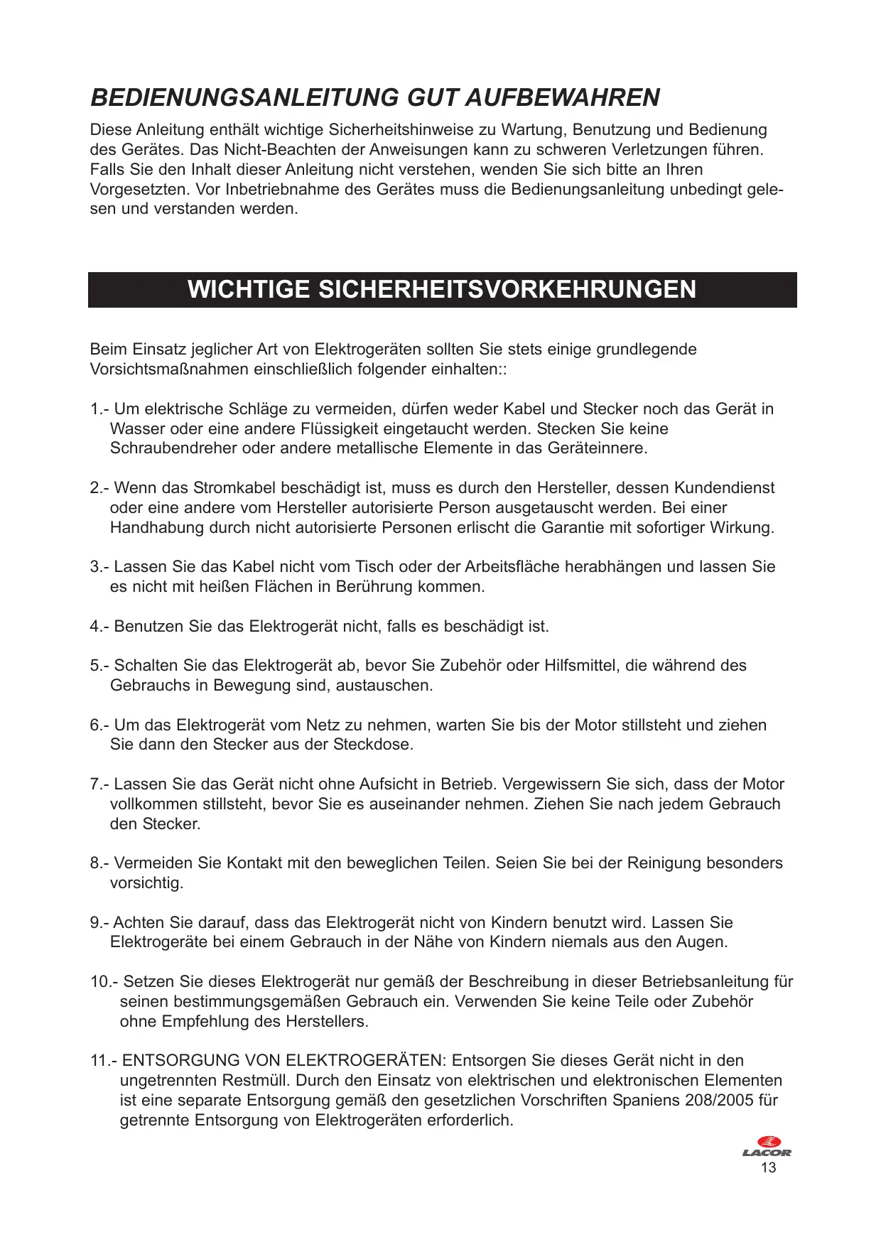 - LACOR MENAJE PROFESIONAL, S.L. haftet noch bei Störungen, die durch unsachgemäßen Aufbau oder Einsatz des Geräts hervorgerufen wurden.