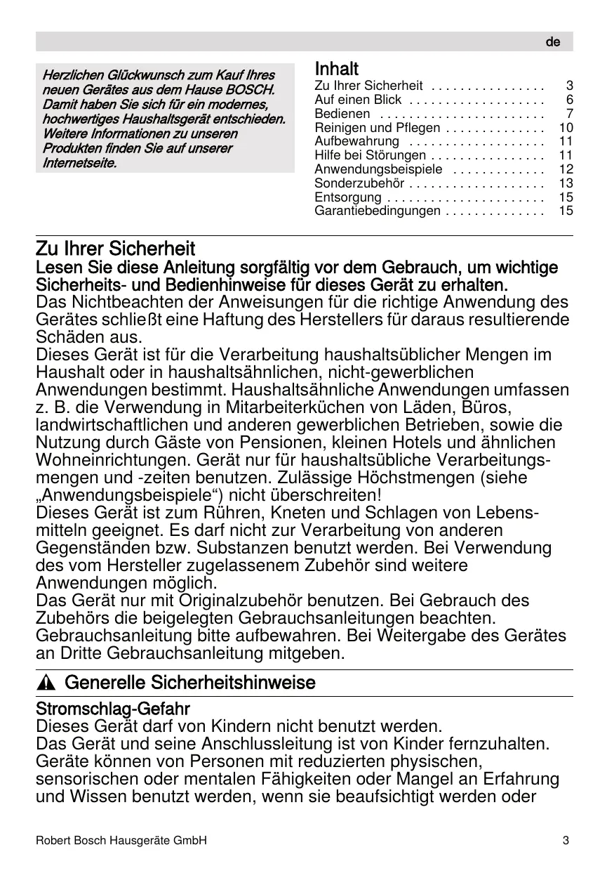 Zu Ihrer Sicherheit Lesen Sie diese Anleitung sorgfältig vor dem Gebrauch, um wichtige Sicherheits- und Bedienhinweise für dieses Gerät zu erhalten. Das Nichtbeachten der Anweisungen für die richtige Anwendung des Gerätes schließt eine Haftung des Herstellers für daraus resultierende Schäden aus. Dieses Gerät ist für die Verarbeitung haushaltsüblicher Mengen im Haushalt oder in haushaltsähnlichen, nicht-gewerblichen Anwendungen bestimmt. Haushaltsähnliche Anwendungen umfassen z. B. die Verwendung in Mitarbeiterküchen von Läden, Büros, landwirtschaftlichen und anderen gewerblichen Betrieben, sowie die Nutzung durch Gäste von Pensionen, kleinen Hotels und ähnlichen Wohneinrichtungen. Gerät nur für haushaltsübliche Verarbeitungsmengen und -zeiten benutzen. Zulässige Höchstmengen (siehe „Anwendungsbeispiele“) nicht überschreiten! Dieses Gerät ist zum Rühren, Kneten und Schlagen von Lebensmitteln geeignet. Es darf nicht zur Verarbeitung von anderen Gegenständen bzw. Substanzen benutzt werden. Bei Verwendung des vom Hersteller zugelassenem Zubehör sind weitere Anwendungen möglich. Das Gerät nur mit Originalzubehör benutzen. Bei Gebrauch des Zubehörs die beigelegten Gebrauchsanleitungen beachten. Gebrauchsanleitung bitte aufbewahren. Bei Weitergabe des Gerätes an Dritte Gebrauchsanleitung mitgeben. , Generelle Sicherheitshinweise Stromschlag-Gefahr Dieses Gerät darf von Kindern nicht benutzt werden. Das Gerät und seine Anschlussleitung ist von Kinder fernzuhalten. Geräte können von Personen mit reduzierten physischen, sensorischen oder mentalen Fähigkeiten oder Mangel an Erfahrung und Wissen benutzt werden, wenn sie beaufsichtigt werden oder Robert Bosch Hausgeräte GmbH