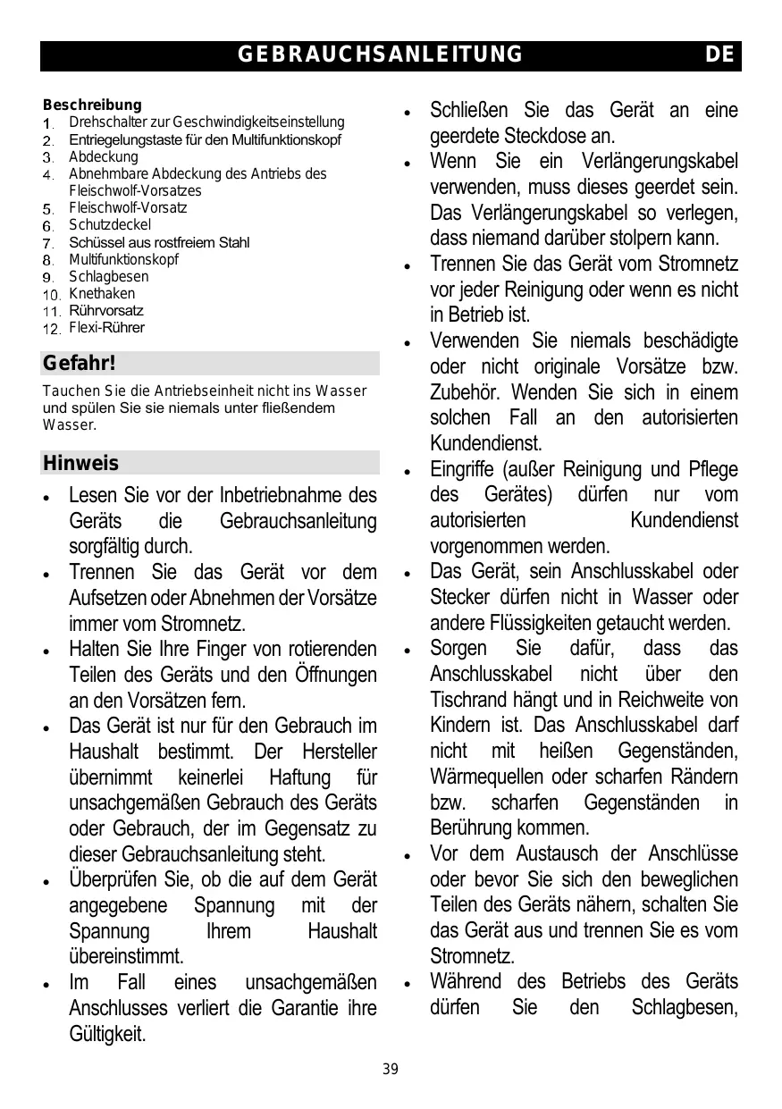 Obturateur amovible pour la prise de courant du hachoir Bouton de déverrouillage du couteau Prise de courant pour le hachoir Couvercle du bol Bol en acier inoxydable Tête multifonction Fouet Crochet pétrisseur éléments mobiles et des orifices destinés à l'insertion des accessoires. Utilisez l'appareil uniquement pour l'usage ménager auquel il est destiné. Le fabricant déclinera toute responsabilité si l'appareil fait l'objet d'une utilisation inappropriée ou si les présentes instructions ne sont pas respectées. Vérifiez que la tension nominale de votre appareil correspond bien à celle de votre réseau électrique. Toute erreur de raccordement annulera la garantie. L'appareil doit être branché à une prise raccordée à la terre.