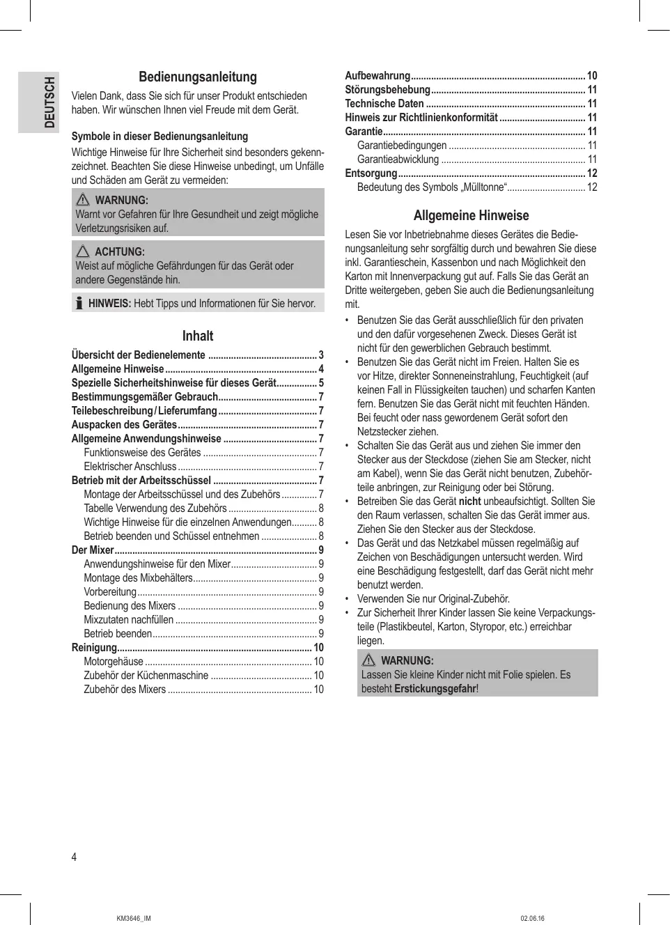 Inhalt Übersicht der Bedienelemente 3 Allgemeine Hinweise 4 Spezielle Sicherheitshinweise für dieses Gerät 5 Bestimmungsgemäßer Gebrauch 7 Teilebeschreibung / Lieferumfang 7 Auspacken des Gerätes 7 Allgemeine Anwendungshinweise 7 Funktionsweise des Gerätes 7 Elektrischer Anschluss 7 Betrieb mit der Arbeitsschüssel 7 Montage der Arbeitsschüssel und des Zubehörs 7 Tabelle Verwendung des Zubehörs 8 Wichtige Hinweise für die einzelnen Anwendungen 8 Betrieb beenden und Schüssel entnehmen 8 Der Mixer 9 Anwendungshinweise für den Mixer 9 Montage des Mixbehälters 9 Vorbereitung 9 Bedienung des Mixers 9 Mixzutaten nachfüllen 9 Betrieb beenden 9 Reinigung 10 Motorgehäuse 10 Zubehör der Küchenmaschine 10 Zubehör des Mixers 10
