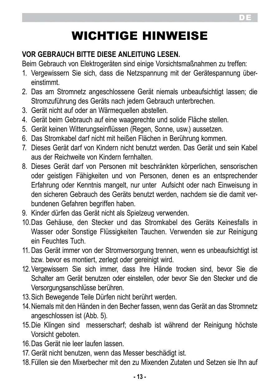 2. Ne laissez jamais l’appareil sans surveillance lorsqu’il est branché au réseau électrique; débranchez-le après chaque utilisation. 3. Ne placez pas l’appareil au dessus ou près de sources de chaleur. 4. Lors de son utilisation, placez l’appareil sur une surface horizontale et stable. 5. N’exposez jamais l’appareil aux agents atmosphériques externes (pluie, soleil, etc.). 6. Veillez à ce que le câble électrique n’entre jamais en contact avec des surfaces chaudes. 7. Cet appareil ne doit pas être utilisé par les enfants. Garder l’appareil et son cordon électrique hors de la portée des enfants. 8. Cet appareil peut être utilisé par des personnes aux capacités physiques, sensorielles ou mentales réduites ou sans expérience ni connaissance si elles sont surveillées ou si elles ont reçu des instructions concernant l’emploi en toute sécurité de l’appareil et si elles ont compris les dangers qui y sont liés. 9. Les enfants ne doivent pas jouer avec l’appareil. 10. Ne pas plonger le corps du produit, la fiche ni le cable electrique dans l’eau ou autres liquides, et utiliser toujours un chiffon humide pour les nettoyer. 11. Débrancher toujours l’appareil du courant électrique quand il n’est pas utilisé et avant de l’assembler, de le démonter ou de le nettoyer. 12. Vérifier d’avoir toujours les mains sèches avant d’utiliser ou de régler les interrupteurs placés sur l’appareil ou avant de manipuler la fiche et les connexions électriques. 13. Ne touchez jamais les parties en mouvement. 14. N’introduisez jamais vos mains dans la tasse quand l’appareil est branché au réseau électrique (Fig. 5). 15. Prêtez la plus grande attention lors du nettoyage des lames car elles sont extrêmement affûtées. 16. Ne faites pas fonctionner l’appareil à vide. 17. N’utilisez pas l’appareil si la lame est endommagée. -9-