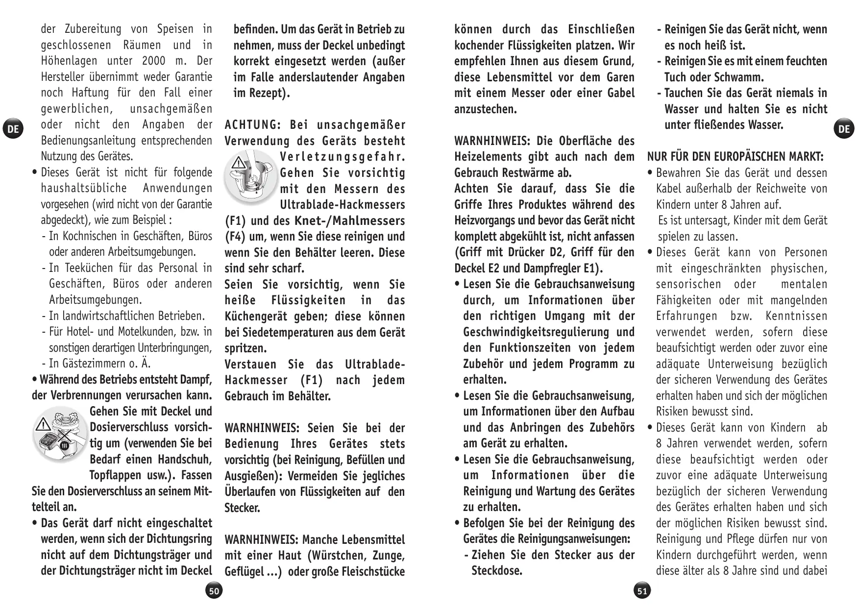 der Zubereitung von Speisen in geschlossenen Räumen und in Höhenlagen unter 2000 m. Der Hersteller übernimmt weder Garantie noch Haftung für den Fall einer gewerblichen, unsachgemäßen oder nicht den Angaben der DE Bedienungsanleitung entsprechenden Nutzung des Gerätes. • Dieses Gerät ist nicht für folgende haushaltsübliche Anwendungen vorgesehen (wird nicht von der Garantie abgedeckt), wie zum Beispiel : - In Kochnischen in Geschäften, Büros oder anderen Arbeitsumgebungen. - In Teeküchen für das Personal in Geschäften, Büros oder anderen Arbeitsumgebungen. - I n landwirtschaftlichen Betrieben. - Für Hotel- und Motelkunden, bzw. in sonstigen derartigen Unterbringungen, - In Gästezimmern o. Ä. • Während des Betriebs entsteht Dampf, der Verbrennungen verursachen kann. Gehen Sie mit Deckel und Dosierverschluss vorsichtig um (verwenden Sie bei Bedarf einen Handschuh, Topflappen usw.). Fassen Sie den Dosierverschluss an seinem Mittelteil an. • Das Gerät darf nicht eingeschaltet werden, wenn sich der Dichtungsring nicht auf dem Dichtungsträger und der Dichtungsträger nicht im Deckel 50