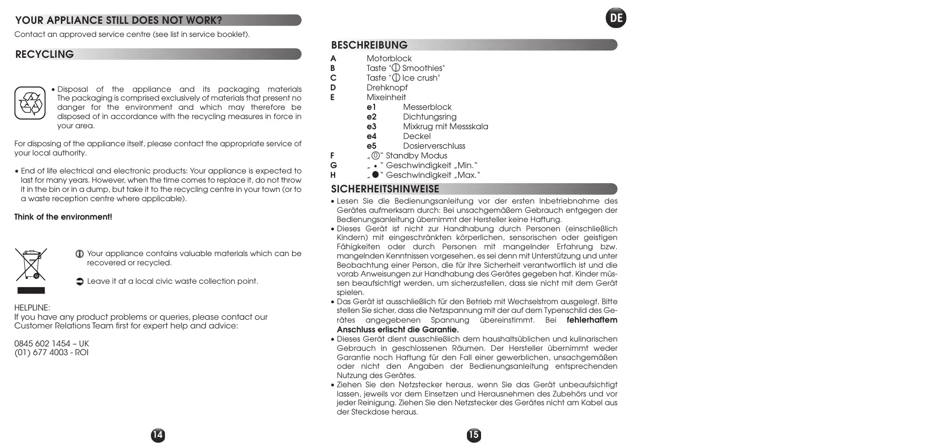• Assurez vous que tout emballage soit retiré avant le fonctionnement de l’appareil. • Remarque importante : Mettre le bouton rotatif (D) sur 0 avant de placer le bol mixeur sur le bloc moteur (A). • L’appareil démarre uniquement si le bol mixeur est bien positionné sur le bloc moteur.