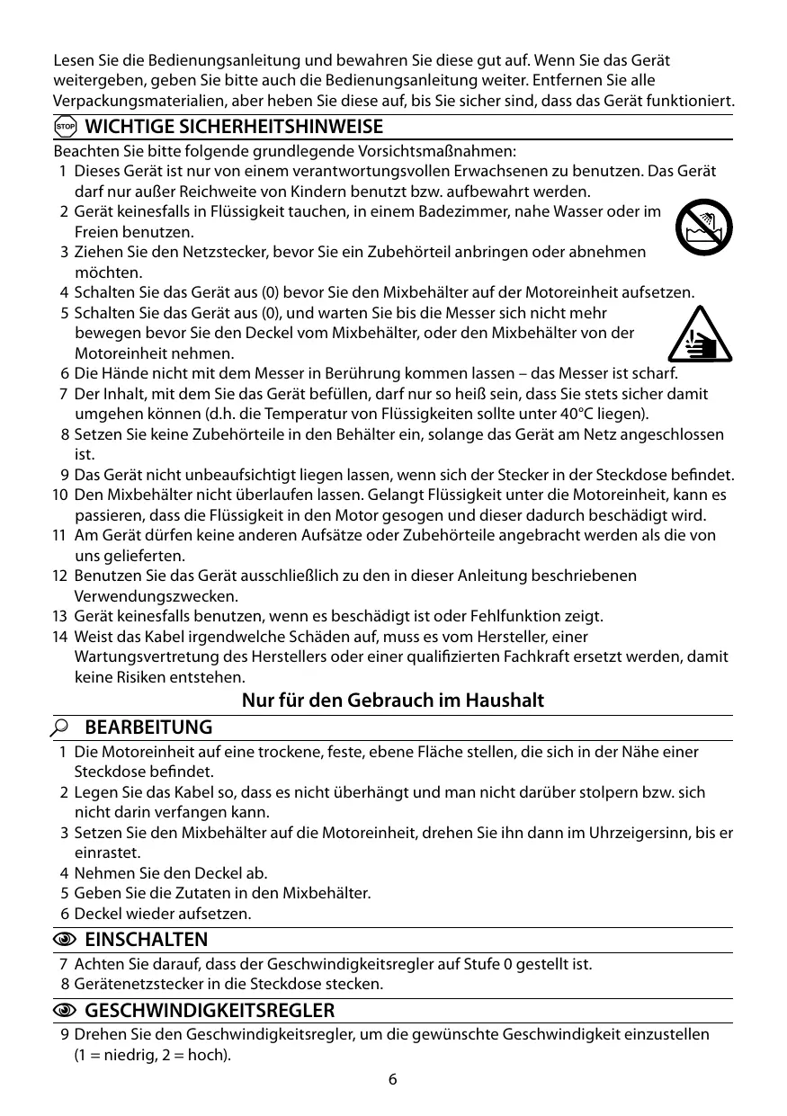 A WICHTIGE SICHERHEITSHINWEISE Beachten Sie bitte folgende grundlegende Vorsichtsmaßnahmen: 1 Dieses Gerät ist nur von einem verantwortungsvollen Erwachsenen zu benutzen. Das Gerät darf nur außer Reichweite von Kindern benutzt bzw. aufbewahrt werden. 2 Gerät keinesfalls in Flüssigkeit tauchen, in einem Badezimmer, nahe Wasser oder im Freien benutzen. 3 Ziehen Sie den Netzstecker, bevor Sie ein Zubehörteil anbringen oder abnehmen möchten. 4 Schalten Sie das Gerät aus (0) bevor Sie den Mixbehälter auf der Motoreinheit aufsetzen. 5 Schalten Sie das Gerät aus (0), und warten Sie bis die Messer sich nicht mehr bewegen bevor Sie den Deckel vom Mixbehälter, oder den Mixbehälter von der Motoreinheit nehmen. 6 Die Hände nicht mit dem Messer in Berührung kommen lassen – das Messer ist scharf. 7 Der Inhalt, mit dem Sie das Gerät befüllen, darf nur so heiß sein, dass Sie stets sicher damit umgehen können (d.h. die Temperatur von Flüssigkeiten sollte unter 40°C liegen). 8 Setzen Sie keine Zubehörteile in den Behälter ein, solange das Gerät am Netz angeschlossen ist. 9 Das Gerät nicht unbeaufsichtigt liegen lassen, wenn sich der Stecker in der Steckdose befindet. 10 Den Mixbehälter nicht überlaufen lassen. Gelangt Flüssigkeit unter die Motoreinheit, kann es passieren, dass die Flüssigkeit in den Motor gesogen und dieser dadurch beschädigt wird. 11 Am Gerät dürfen keine anderen Aufsätze oder Zubehörteile angebracht werden als die von uns gelieferten. 12 Benutzen Sie das Gerät ausschließlich zu den in dieser Anleitung beschriebenen Verwendungszwecken. 13 Gerät keinesfalls benutzen, wenn es beschädigt ist oder Fehlfunktion zeigt. 14 Weist das Kabel irgendwelche Schäden auf, muss es vom Hersteller, einer Wartungsvertretung des Herstellers oder einer qualifizierten Fachkraft ersetzt werden, damit keine Risiken entstehen.