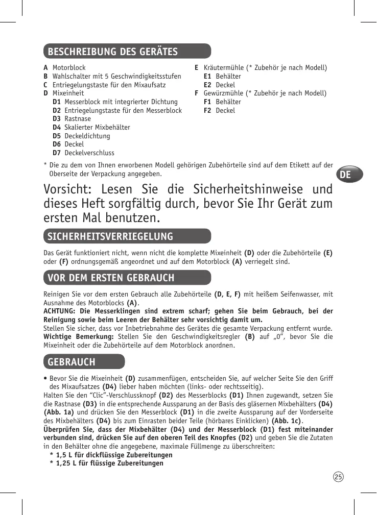 Het apparaat zal niet werken als de mengkan assemblage (D) of de accessoires (E) of (F) niet juist zijn geplaatst en op het motorblok (A) zijn vergrendeld.