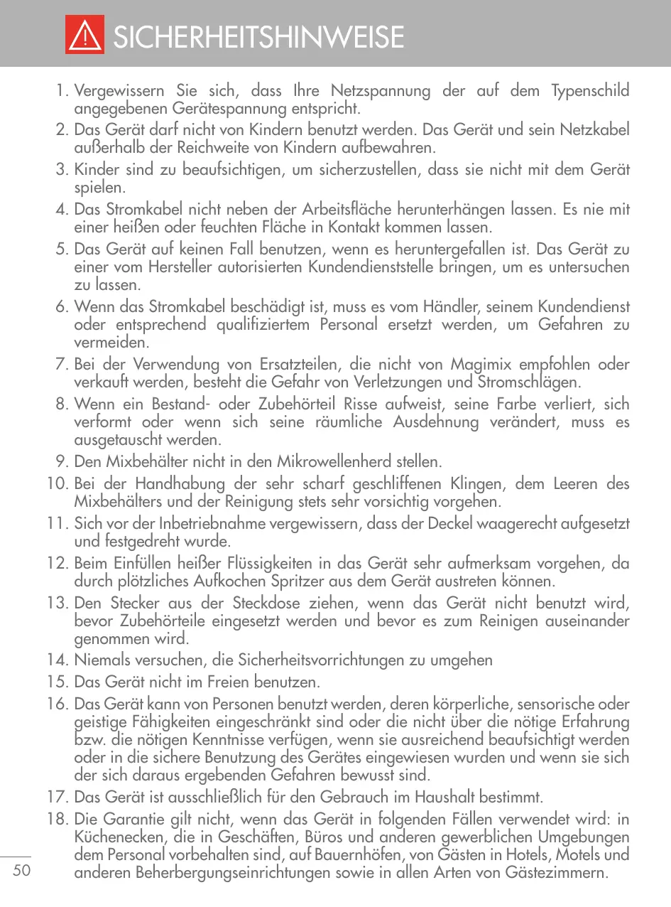 SICHERHEITSHINWEISE 01. Vergewissern Sie sich, dass Ihre Netzspannung der auf dem Typenschild angegebenen Gerätespannung entspricht. 02. Das Gerät darf nicht von Kindern benutzt werden. Das Gerät und sein Netzkabel außerhalb der Reichweite von Kindern aufbewahren. 03. Kinder sind zu beaufsichtigen, um sicherzustellen, dass sie nicht mit dem Gerät spielen. 04. Das Stromkabel nicht neben der Arbeitsfläche herunterhängen lassen. Es nie mit einer heißen oder feuchten Fläche in Kontakt kommen lassen. 05. Das Gerät auf keinen Fall benutzen, wenn es heruntergefallen ist. Das Gerät zu einer vom Hersteller autorisierten Kundendienststelle bringen, um es untersuchen zu lassen. 06. Wenn das Stromkabel beschädigt ist, muss es vom Händler, seinem Kundendienst oder entsprechend qualifiziertem Personal ersetzt werden, um Gefahren zu vermeiden. 07. Bei der Verwendung von Ersatzteilen, die nicht von Magimix empfohlen oder verkauft werden, besteht die Gefahr von Verletzungen und Stromschlägen. 08. Wenn ein Bestand- oder Zubehörteil Risse aufweist, seine Farbe verliert, sich verformt oder wenn sich seine räumliche Ausdehnung verändert, muss es ausgetauscht werden. 09. Den Mixbehälter nicht in den Mikrowellenherd stellen. 10. Bei der Handhabung der sehr scharf geschliffenen Klingen, dem Leeren des Mixbehälters und der Reinigung stets sehr vorsichtig vorgehen. 11. Sich vor der Inbetriebnahme vergewissern, dass der Deckel waagerecht aufgesetzt und festgedreht wurde. 12. Beim Einfüllen heißer Flüssigkeiten in das Gerät sehr aufmerksam vorgehen, da durch plötzliches Aufkochen Spritzer aus dem Gerät austreten können. 13. Den Stecker aus der Steckdose ziehen, wenn das Gerät nicht benutzt wird, bevor Zubehörteile eingesetzt werden und bevor es zum Reinigen auseinander genommen wird. 14. Niemals versuchen, die Sicherheitsvorrichtungen zu umgehen 15. Das Gerät nicht im Freien benutzen. 16. Das Gerät kann von Personen benutzt werden, deren körperliche, sensorische oder geistige Fähigkeiten eingeschränkt sind oder die nicht über die nötige Erfahrung bzw. die nötigen Kenntnisse verfügen, wenn sie ausreichend beaufsichtigt werden oder in die sichere Benutzung des Gerätes eingewiesen wurden und wenn sie sich der sich daraus ergebenden Gefahren bewusst sind. 17. Das Gerät ist ausschließlich für den Gebrauch im Haushalt bestimmt. 18. Die Garantie gilt nicht, wenn das Gerät in folgenden Fällen verwendet wird: in Küchenecken, die in Geschäften, Büros und anderen gewerblichen Umgebungen dem Personal vorbehalten sind, auf Bauernhöfen, von Gästen in Hotels, Motels und 50 anderen Beherbergungseinrichtungen sowie in allen Arten von Gästezimmern.