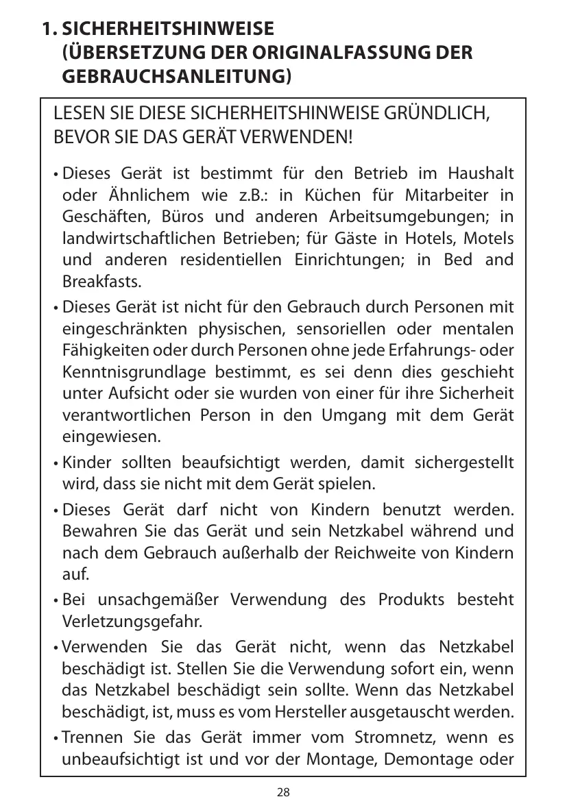 • L’appareil est destiné à un usage domestique seulement et n’est pas destiné à être utilisé dans des applications telles que : les cuisines du personnel dans les magasins, les bureaux et autres environnements de travail ; les fermes ; par les clients d’hôtels, de motels et d’autres environnements de type résidentiel ; les établissements de type chambres d’hôtes. • Cet appareil n’est pas destiné à être utilisé par des personnes ayant des capacités physiques, sensorielles ou mentales réduites ou un manque d’expérience et de connaissances, à moins qu’elles soient sous surveillance ou aient été informées de la manière de l’utiliser par une personne responsable de leur sécurité. • Surveiller les enfants afin de vous assurer qu’ils ne jouent pas avec ce produit. • Cet appareil ne doit pas être utilisé par des enfants. Garder l’appareil et son cordon d’alimentation hors de portée des enfants pendant et après son utilisation. • Il y a un risque de blessure si le produit est mal utilisé. • Ne pas utiliser l’appareil si le cordon d’alimentation est endommagé. Si le cordon d’alimentation est endommagé, cesser immédiatement d’utiliser l’appareil. Si le cordon d’alimentation est endommagé, le fabricant doit le remplacer afin d’éviter tout risque. • Toujours débrancher l’appareil de l’alimentation si vous le laissez sans surveillance ainsi qu’avant le montage, le démontage ou le nettoyage. • ATTENTION : Etre prudent lorsque vous manipulez les lames tranchantes, videz les bols et procédez au nettoyage. Ne pas 1