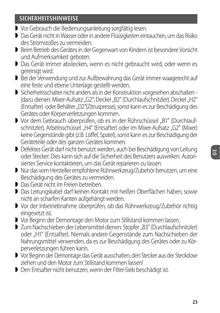 Vor Gebrauch die Bedienungsanleitung sorgfältig lesen. Das Gerät nicht in Wasser oder in andere Flüssigkeiten eintauchen, um das Risiko des Stromstoßes zu vermeiden. Beim Betrieb des Gerätes in der Gegenwart von Kindern ist besondere Vorsicht und Aufmerksamkeit geboten. Das Gerät immer abstecken, wenn es nicht gebraucht wird, oder wenn es gereinigt wird. Bei der Verwendung und zur Aufbewahrung das Gerät immer waagerecht auf eine feste und ebene Unterlage gestellt werden. Sicherheitsschalter nicht anders als in der Konstruktion vorgesehen abschalten (dazu dienen: Mixer-Aufsatz „G2”; Deckel „B2” (Durchlaufschnitzler), Deckel „H2” (Entsafter) oder Behälter „D2”(Zitruspresse), sonst kann es zur Beschädigung des Gerätes oder Körperverletzungen kommen. Vor dem Gebrauch überprüfen, ob es in der Rührschüssel „B1” (Durchlaufschnitzler), Arbeitsschüssel „H4” (Entsafter) oder im Mixer-Aufsatz „G2” (Mixer) keine Gegenstände gibt (z.B. Löffel, Spatel), sonst kann es zur Beschädigung der Geräteteile oder des ganzen Gerätes kommen. Defektes Gerät darf nicht benutzt werden, auch bei Beschädigung von Leitung oder Stecker. Dies kann sich auf die Sicherheit des Benutzers auswirken. Autorisiertes Service kontaktieren, um das Gerät reparieren zu lassen. Nur das vom Hersteller empfohlene Rührwerkzeug/Zubehör benutzen, um eine Beschädigung des Gerätes zu vermeiden. Das Gerät nicht im Freien betreiben. Das Leitungskabel darf keinen Kontakt mit heißen Oberflächen haben, sowie nicht an scharfen Kanten aufgehängt werden. Vor der Inbetriebnahme überprüfen, ob das Rührwerkzeug/Zubehör richtig eingesetzt ist. Vor Beginn der Demontage den Motor zum Stillstand kommen lassen. Zum Nachschieben der Lebensmittel dienen: Stopfer „B3” (Durchlaufschnitzler) oder „H1” (Entsafter). Niemals andere Gegenstände zum Nachschieben der Nahrungsmittel verwenden, da es zur Beschädigung des Gerätes oder zu Körperverletzungen führen kann. Vor Beginn der Demontage das Gerät ausschalten, den Stecker aus der Steckdose ziehen und den Motor zum Stillstand kommen lassen! Den Entsafter nicht benutzen, wenn der Filter-Sieb beschädigt ist.