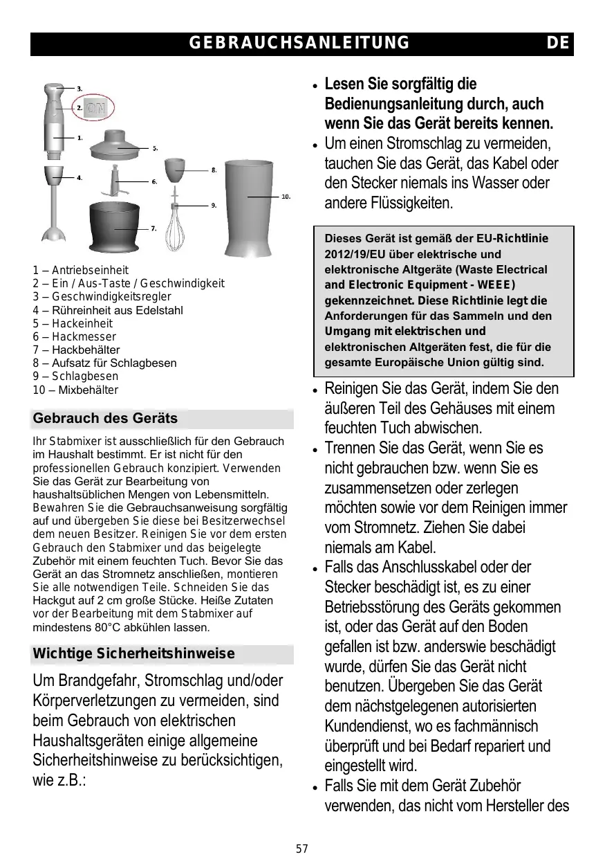 Électrique et Électronique (DEEE). Cette directive sert de règlement cadre à la reprise, au recyclage et à la valorisation des appareils ménagers usagés dans toute l’Union européenne. • 1. 2. Couteau du hachoir Bol hachoir Corps du batteur Fouetter Bécher Avant la première utilisation, essuyez la poignée du mixeur avec un linge humide. Assemblez l'appareil correctement avant de le brancher à une prise secteur. Avant de les passer au mixeur ou de les verser dans le bol, coupez les gros ingrédients en morceaux de 2 cm environ et laissez-les refroidir s'ils sont chauds (température max 80°C).