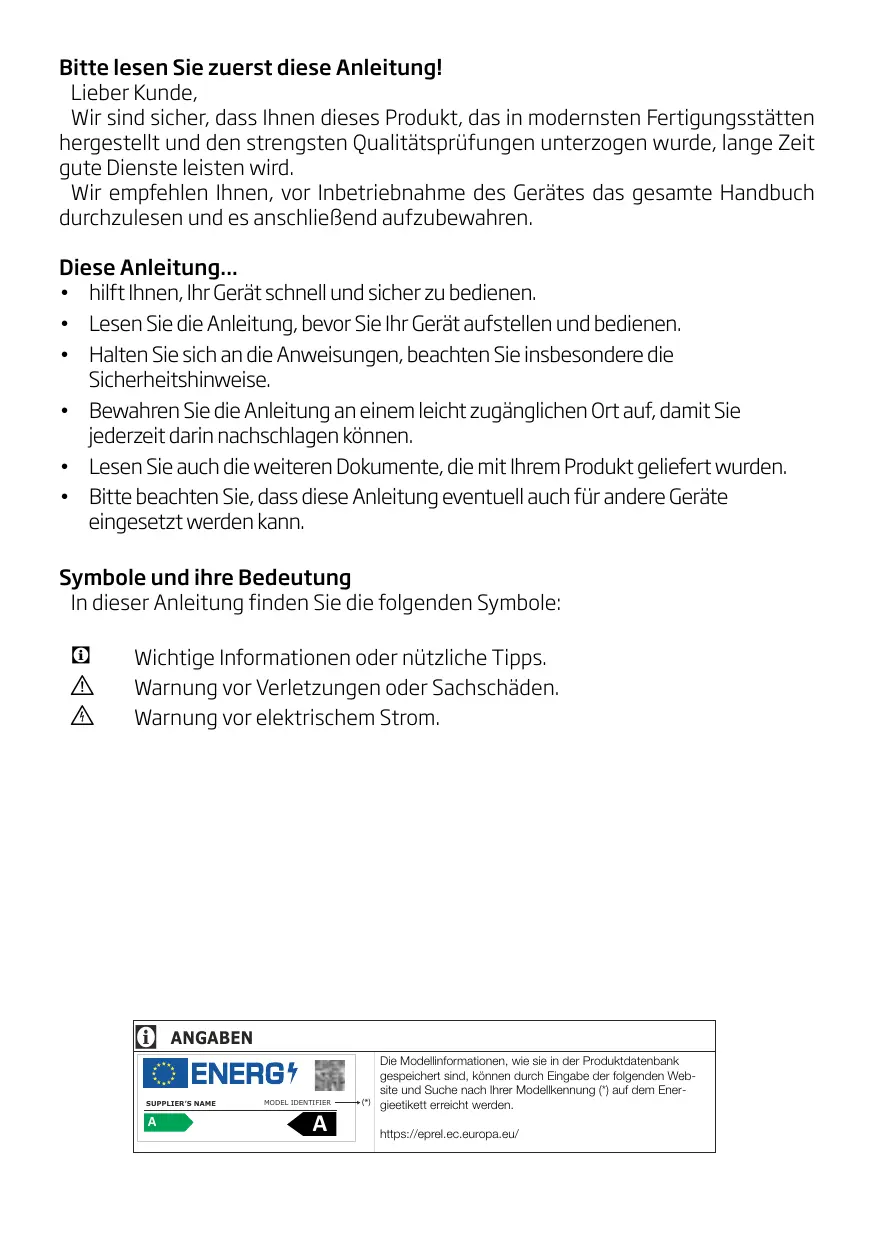 EN Bitte lesen Sie zuerst diese Anleitung! Lieber Kunde, Wir sind sicher, dass Ihnen dieses Produkt, das in modernsten Fertigungsstätten hergestellt und den strengsten Qualitätsprüfungen unterzogen wurde, lange Zeit gute Dienste leisten wird. Wir empfehlen Ihnen, vor Inbetriebnahme des Gerätes das gesamte Handbuch durchzulesen und es anschließend aufzubewahren. Diese Anleitung... t hilft Ihnen, Ihr Gerät schnell und sicher zu bedienen. t Lesen Sie die Anleitung, bevor Sie Ihr Gerät aufstellen und bedienen. t Halten Sie sich an die Anweisungen, beachten Sie insbesondere die Sicherheitshinweise. t Bewahren Sie die Anleitung an einem leicht zugänglichen Ort auf, damit Sie jederzeit darin nachschlagen können. t Lesen Sie auch die weiteren Dokumente, die mit Ihrem Produkt geliefert wurden. t Bitte beachten Sie, dass diese Anleitung eventuell auch für andere Geräte eingesetzt werden kann. Symbole und ihre Bedeutung In dieser Anleitung finden Sie die folgenden Symbole: